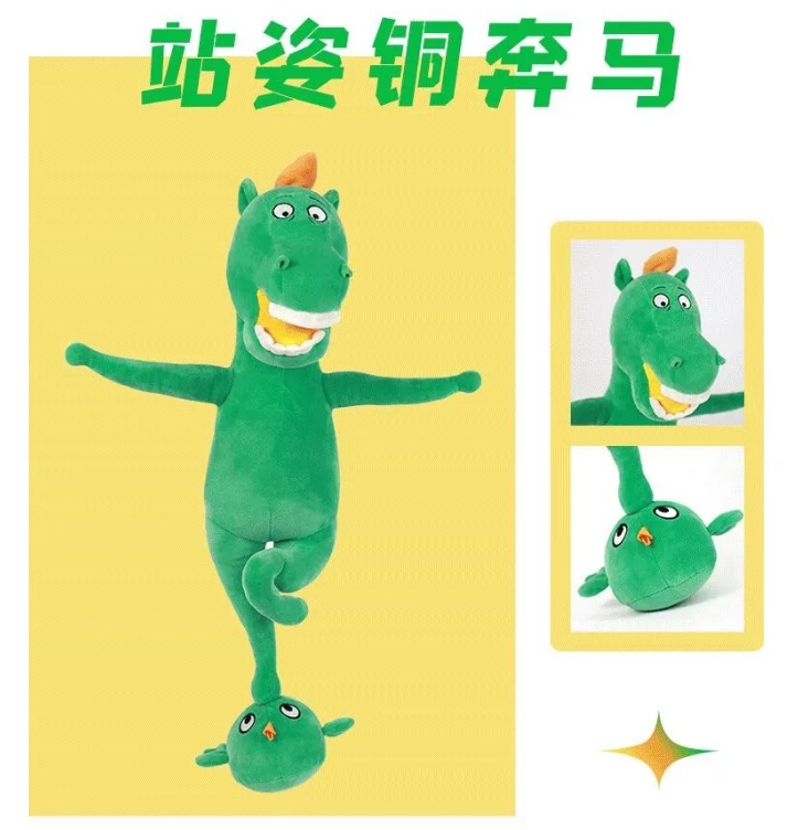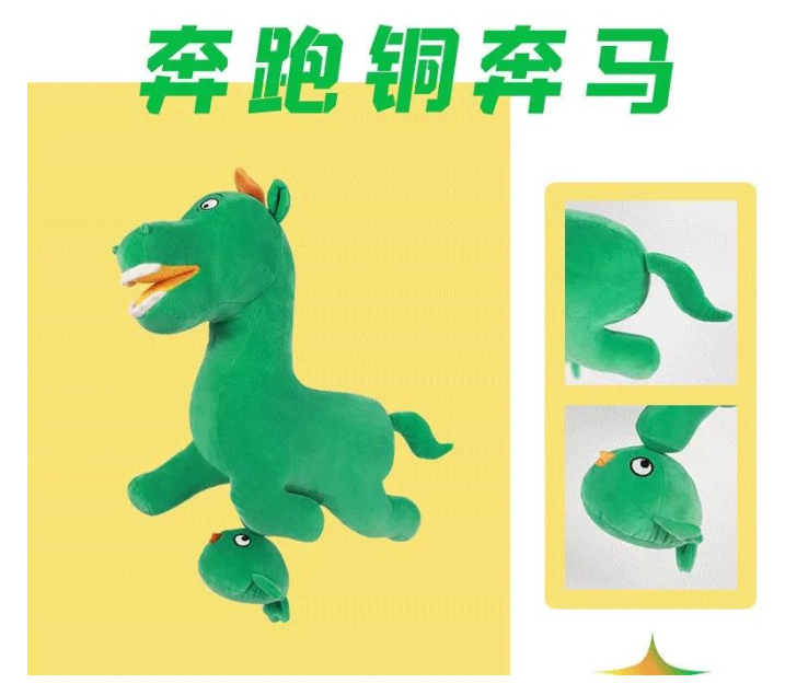 为此,甘肃省博物馆文创设计团队还原了文物姿态细节——铜奔马调皮可爱的正面神态,并由此推出了两种姿态的毛绒玩具: