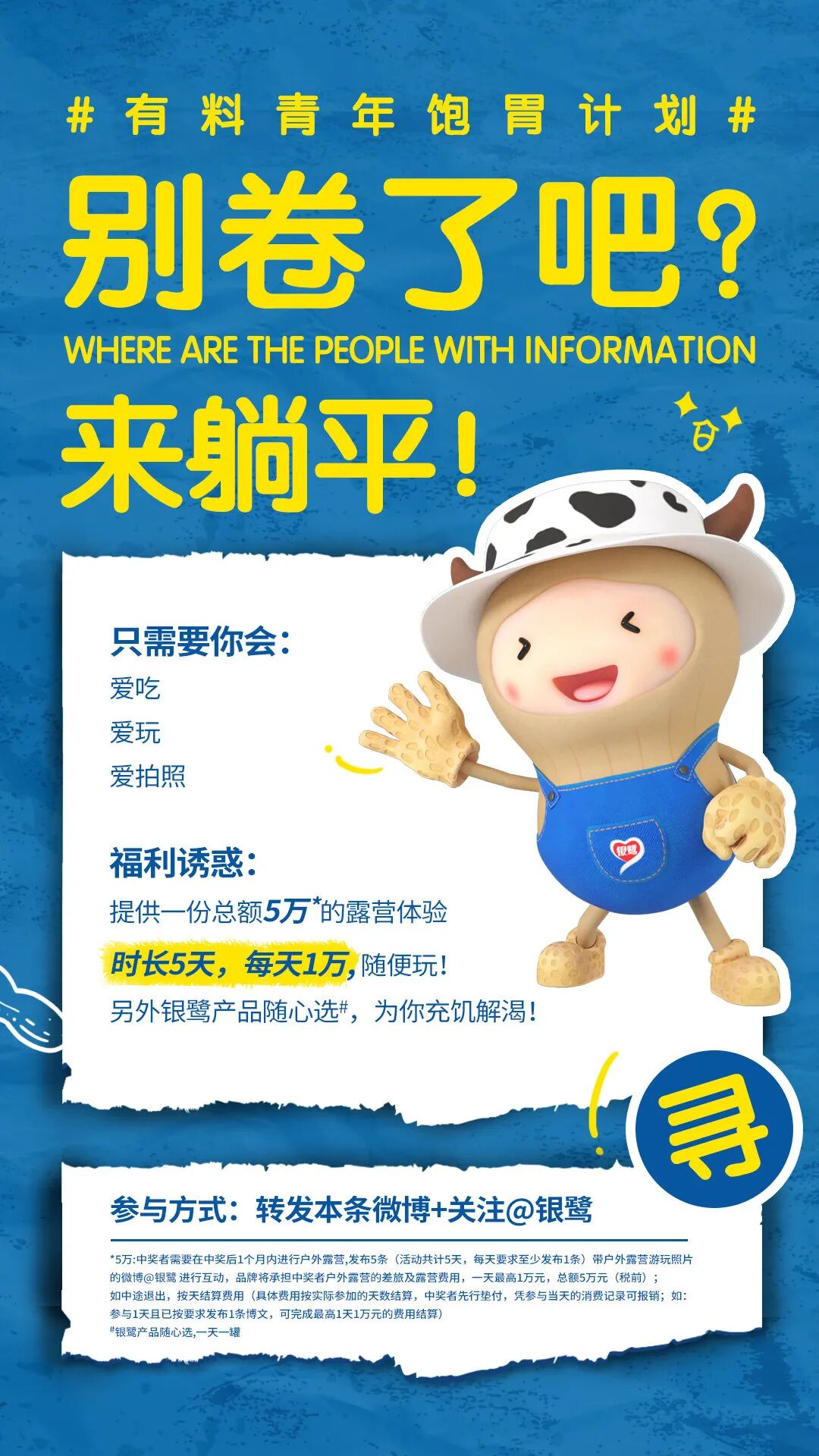通过为志同道合的有料青年提供5万露营基金的招募方式,银鹭牛奶花生让网络互动和综艺植入两条传播线遥相呼应,融为一体,扩大了传播势能,用四两拨千斤的方式,完成了破圈层式的传播效果。