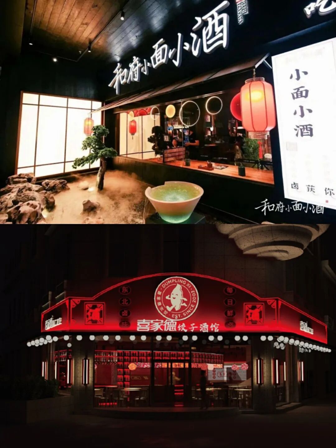 喜家德饺子酒馆也是同样的路径,标志性红色、饺子形门头,满眼霓虹灯,墙上张贴着“饺子就酒,越喝越有”的宣传口号。