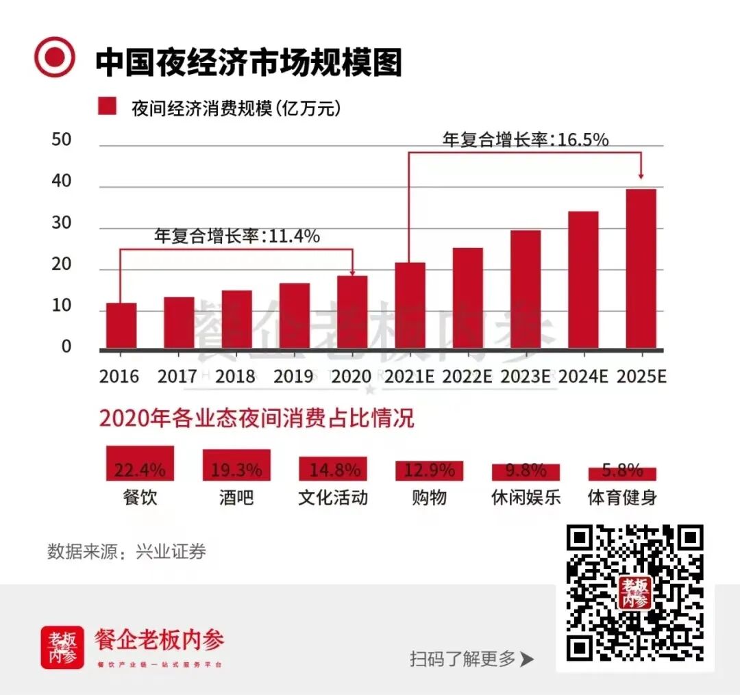 与此同时,国内夜间经济发展水平也在快速增长。根据国元证券报告分析,预计2022全年规模将突破40万亿。从消费占比来看,当前国内夜间餐饮消费额占全天餐饮消费额已经达到四成,在夜间经济中,酒吧业态仅次于纯餐饮业态。