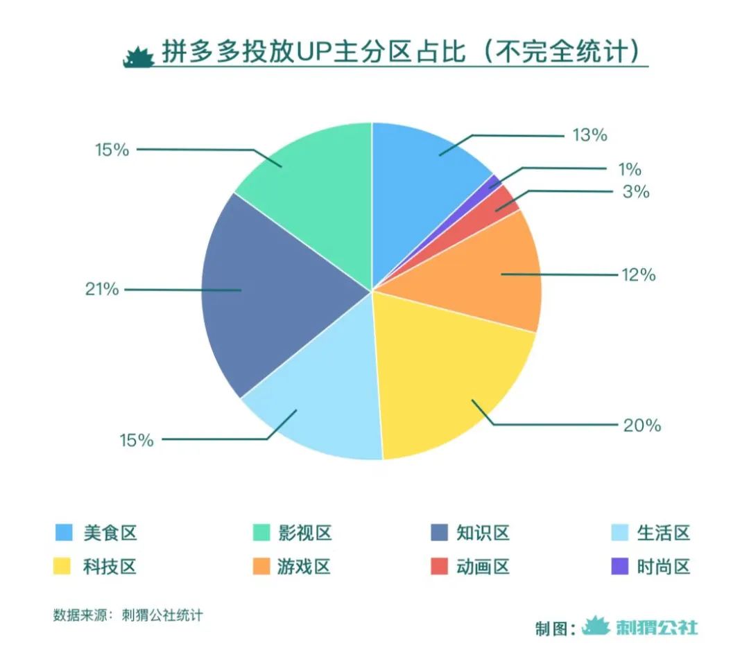 2021年开始,拼多多开始经常在B站的各类视频中出现。根据刺猬公社的统计,拼多多主要投放的分区主要为:知识区、生活区、美食区、影视区、科技区,覆盖了B站用户最活跃的几大分区。