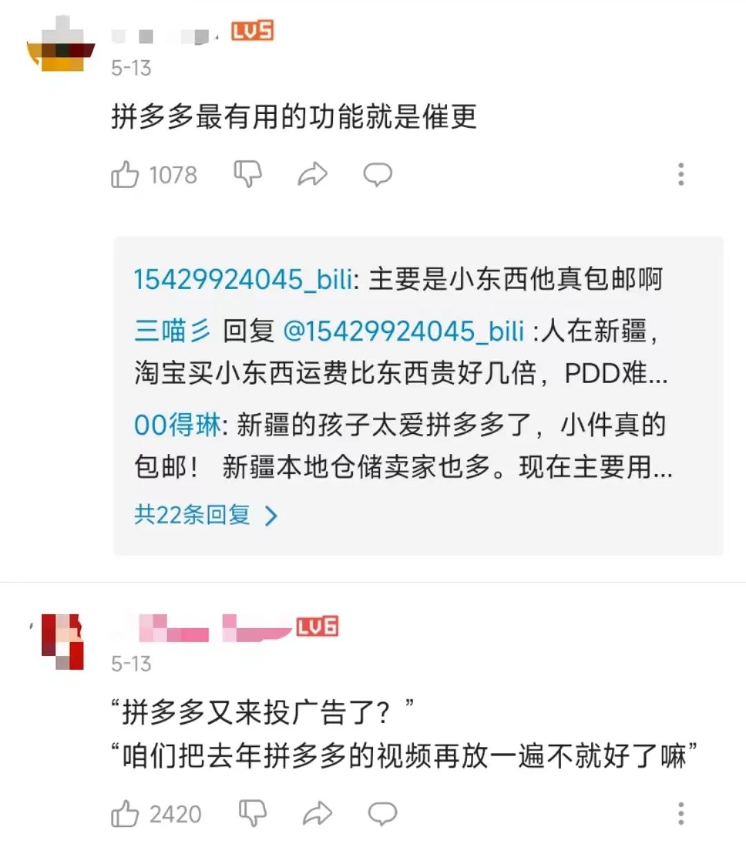 无论如何,拼多多从一点上成功了:它成功让自己成为B站用户的讨论焦点之一,并让所有人记住了百亿补贴的“威名”。