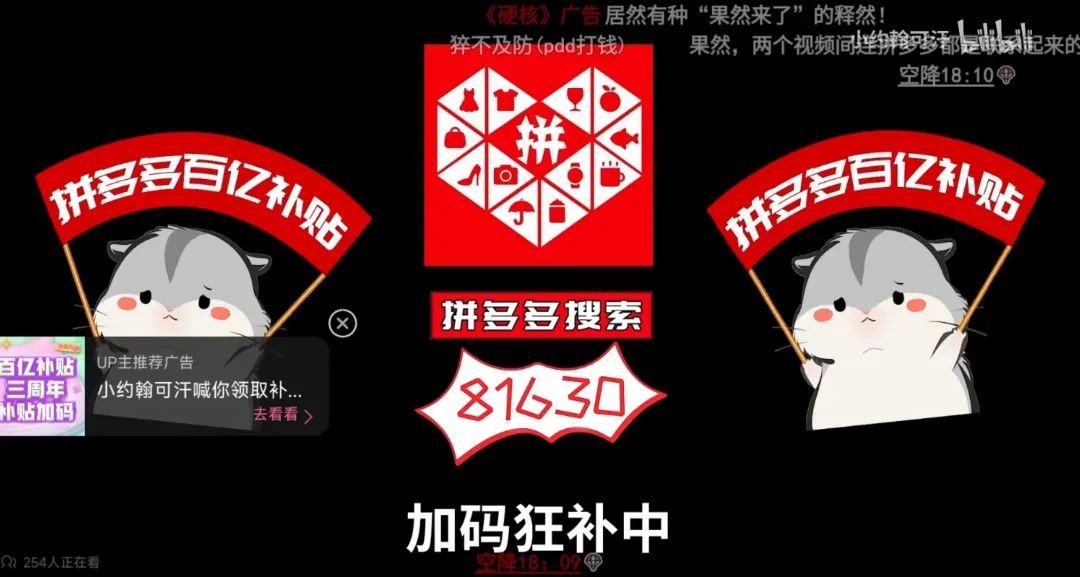 不少品牌会在B站进行广告营销,但若要选出一个投放王者,则非拼多多莫属。很多时候,上一秒UP主还在屏幕上滔滔不绝,下一秒就“转进”到了百亿补贴的广告时间。