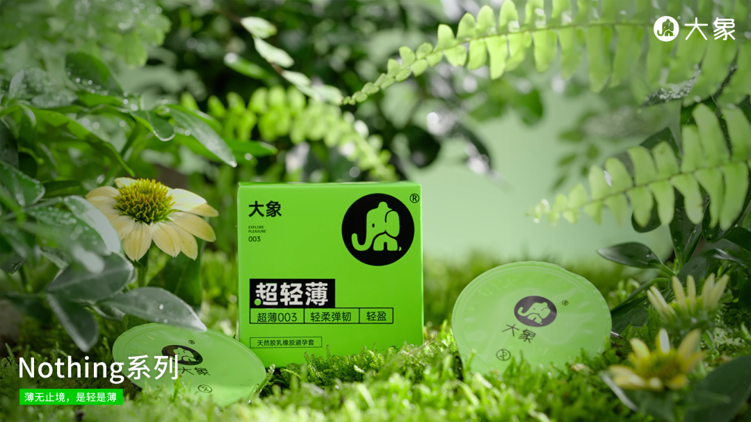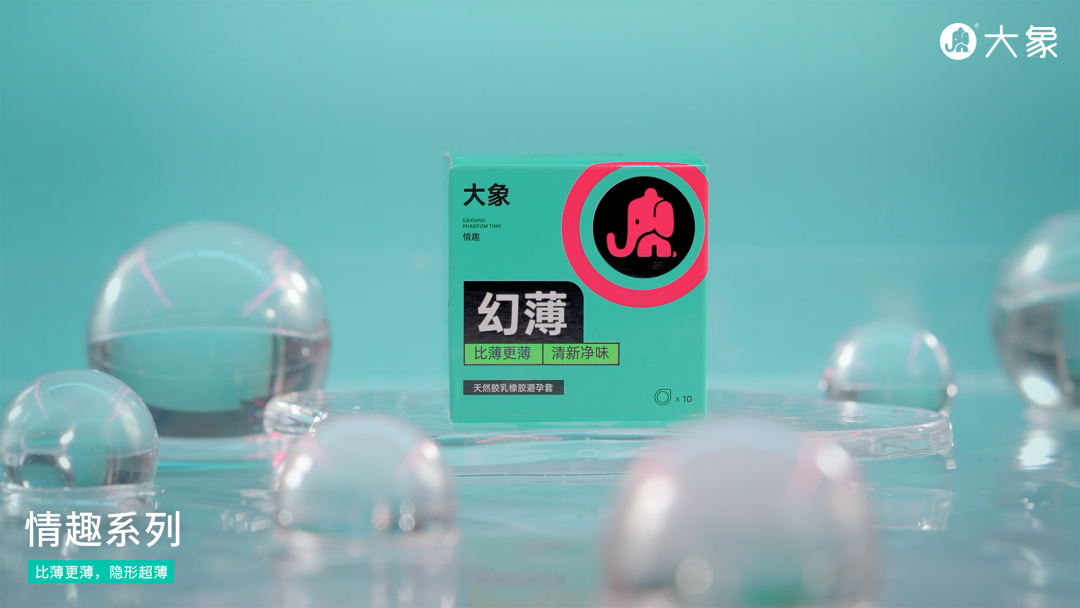 首先在外包装盒统一成以大象品牌LOGO置于右上角,产品种类的文字信息放在左下角的版式设计,画面简洁明了。统一版式设计后,大象通过以颜色来对产品种类进行区分。像经典绿色款,对应的大象“超润薄”以及“超轻薄”系列产品,给人一种朝气活力的视觉感。“高潮水滑”款从女性需求出发,采用的是少女心的粉色,这个设计真的很贴心,也能充分看到大象品牌沉淀下来的品牌优势,更关注女性身体健康和使用感受。通过这种简洁醒目的设计,帮助女性在收银时第一眼能够识别到,快速找到购买亮点,减少人多聚集结账的尴尬。而好的包装设计,除了本身能突出产品属性之外,更重要的是从购买动线、产品陈列、用户购买心理等多个维度进行思考,而不是单一外观属性,能够通过包装设计的力量促进用户的消费力,这才是真正大象包装设计的核心。比如针对男性用户群体,这款包装设计采用的是高端典雅的黑色包装结合烫金工艺,暗金的光影随着视角变幻流淌在幻久盒面上,仿佛经历了时间的一点点打磨。比起市面上花哨强调男性功能的包装设计,这种典雅细腻的设计其实更符合当下男性用户群体对品质生活的需求,同时名称的设定也是更加含蓄易懂,正如这款产品亮点轻薄无物通过物理延时和市面上药物延迟的产品使用形成鲜明对比。“自由001”系列采用纯白为主色,辅以黑色做对比,与产品自由、极致的薄、轻奢的特点相互吻合,同时套体也使用了提升5倍弹力的水性聚氨酯,正如包装设计本身,更加经典耐用。采用 Karex 进口超薄技术的“幻薄款”,大胆地利用青和红进行撞色,呈现出年轻潮流的风格,整体版式还是以简洁、醒目为主,拒绝了俗套的设计风格和花哨的概念,更贴近用户喜好本身。一样采用新潮的撞色形式,还有追求刺激情趣的“情趣大颗粒”款系列产品,用黄橙绿进行撞色,通过合适的颜色比例安排,使得视觉上和简约的排版气质相辅相成,大胆且抢夺眼球。回顾九年来大象品牌产品的升级,从一开始的绿色小方盒到后面逐渐以颜色区分。