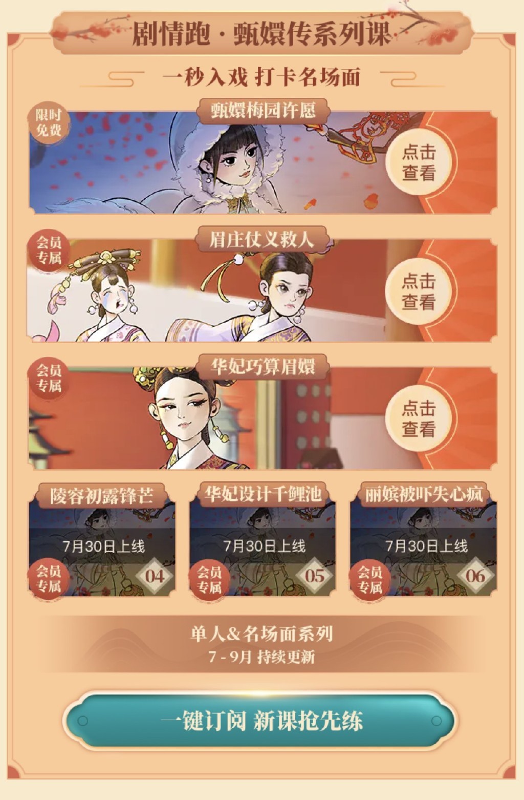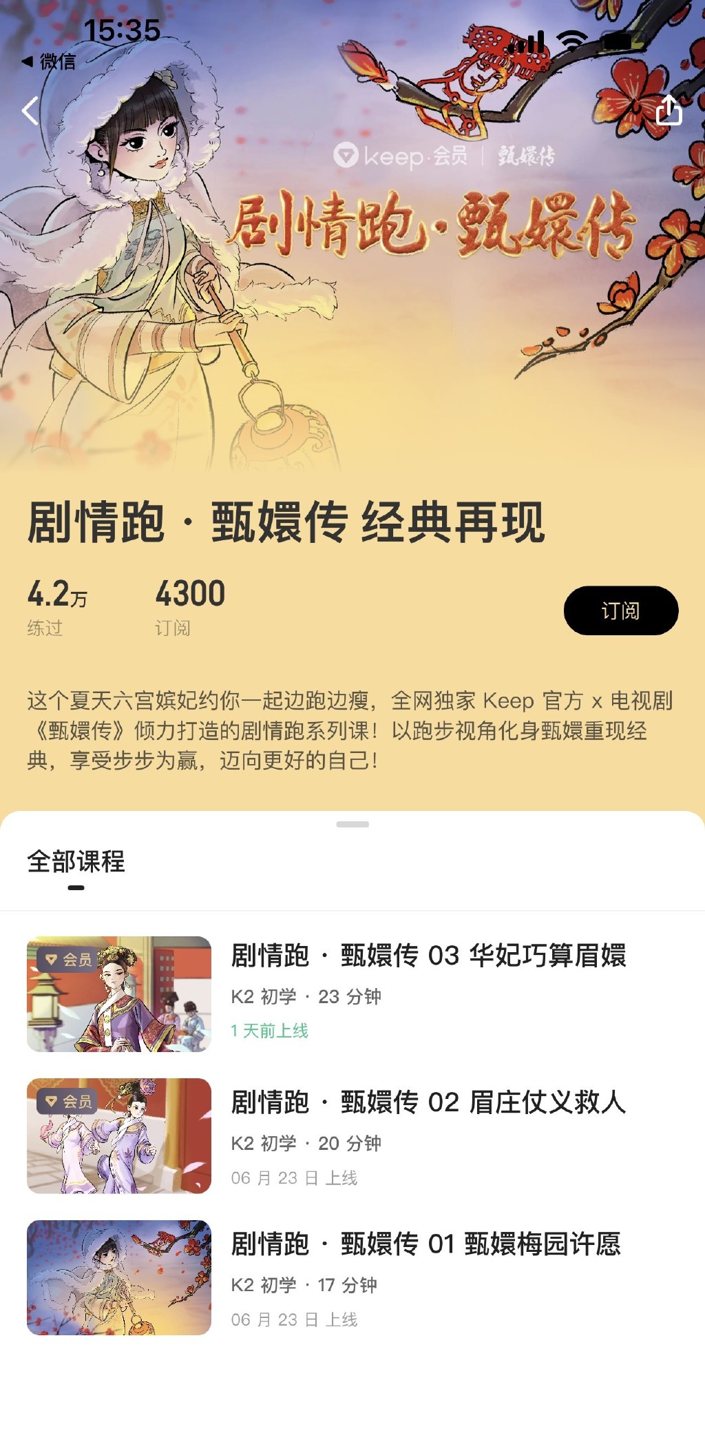 「剧情跑·甄嬛传」课程通过对《甄嬛传》进行名场面还原和剧情再次创作,带领用户以第一视角跑进《甄嬛传》,化身梅园许愿的甄嬛、仗义救人的眉庄、算计甄嬛的华妃、初露锋芒的陵容等,跟随着剧情设置跑步健身,穿越清朝与六宫嫔妃们一同体验后宫职业生涯路。