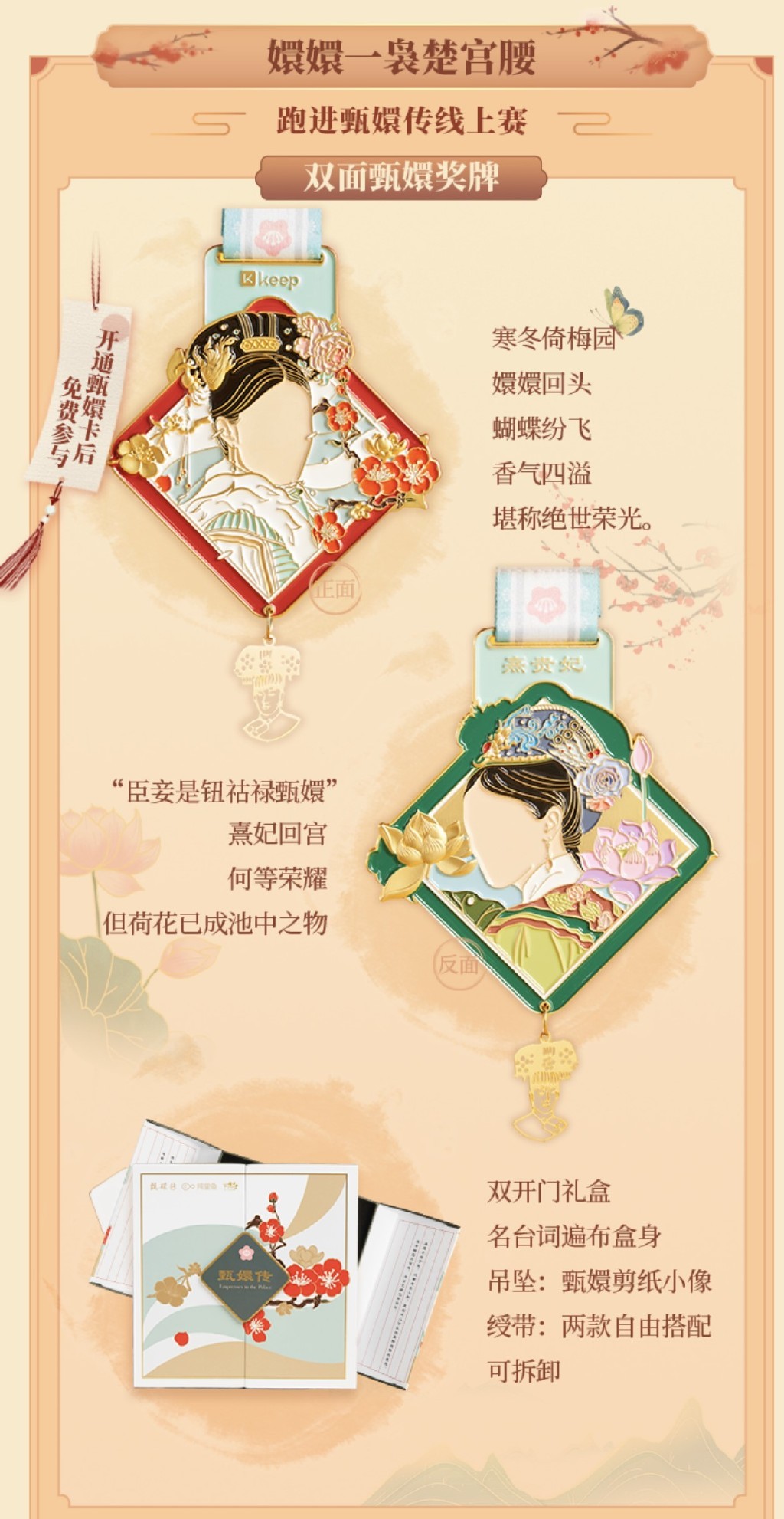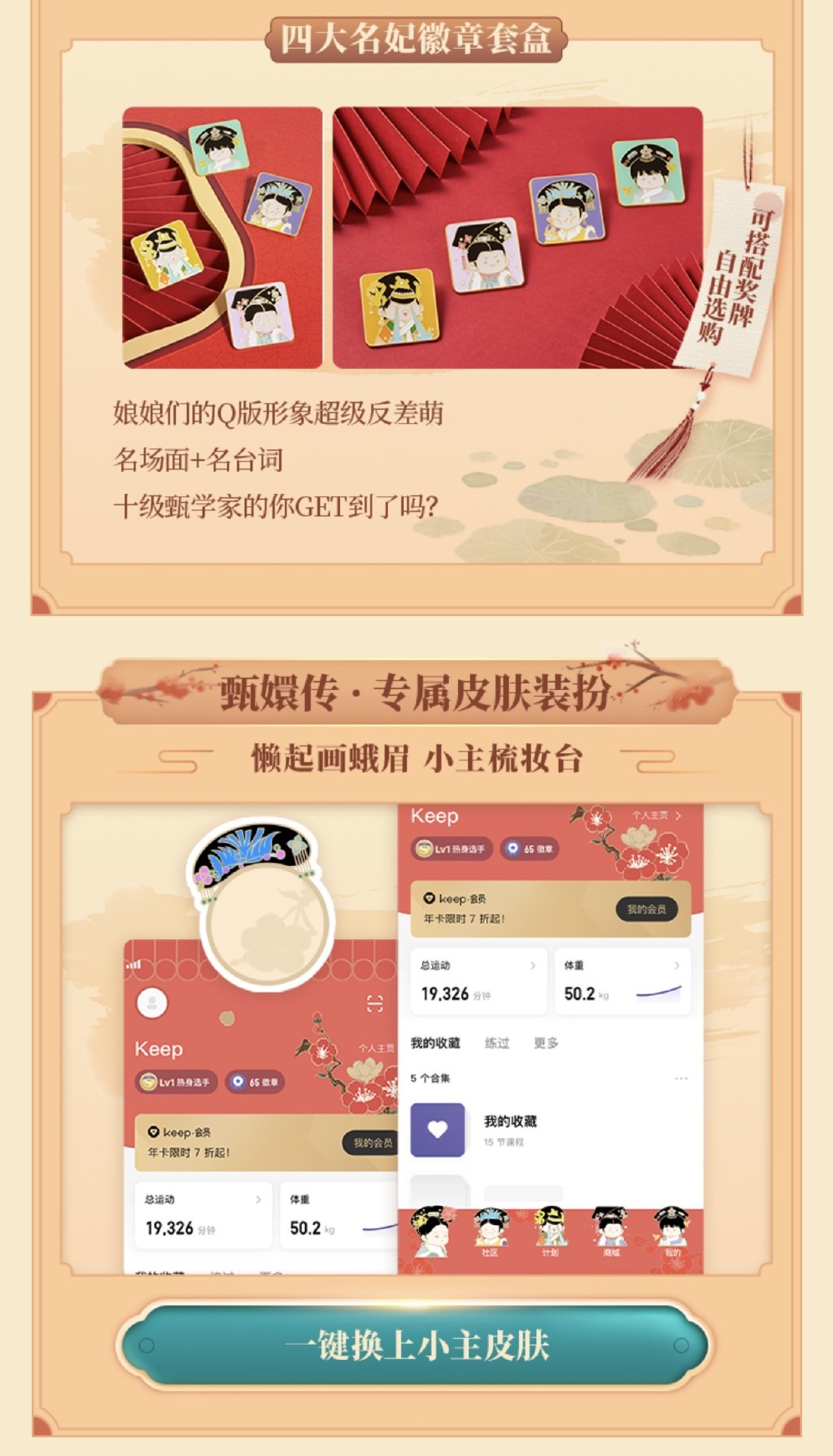 同时,Keep 还推出了「甄嬛主题卡」,用户购买该主题卡可获得会员季卡、剧情跑甄嬛传系列课10节、专属小主皮肤装扮,以及甄嬛专属赛事奖牌等福利。用户完赛后,还可获得双面甄嬛刻字奖牌、四大名妃徽章套盒等。娘娘们的Q版形象徽章,让“十级甄学家”们跃跃欲试。