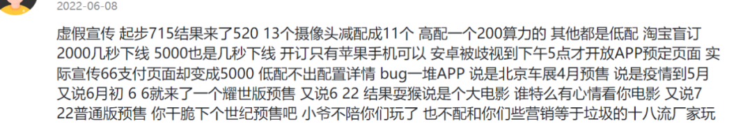 根据车友反馈主要集中在三个点,前期宣传与实际发布配置不符,如此前曾宣传续航715km起步现在却有520km版本,13个摄像头减为11个。