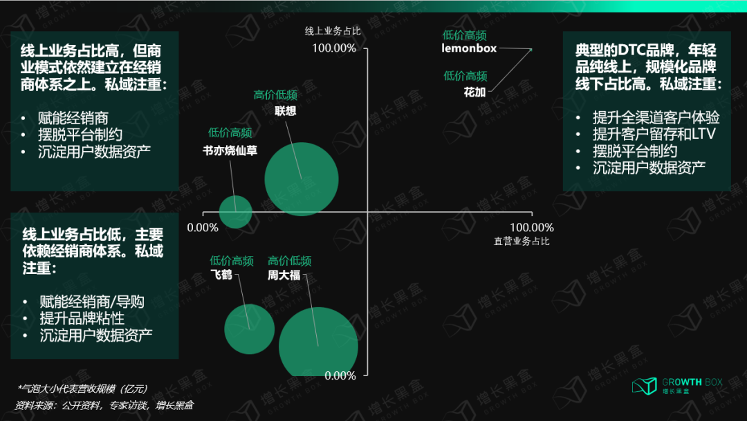 前段时间,腾讯智慧零售发布了《 T+ 品牌私域价值榜单》。腾讯智慧零售在过去四年里服务了近千家企业,成功验证大量可复制的私域业态模式,在长时间和品牌的私域业务合作中,总结私域增长的基础要素,形成“四力增长模型”,助力企业从内外部全面提升私域能力。而这次榜单的评选,正是基于四力增长模型,以整体私域经营状况及四力作为核心评审标准,对企业私域综合竞争力进行评估。四力增长模型包含组织力、商品力、运营力和产品力四大板块:● 组织力:保证私域运营高效运转和目标达成的能力,包括私域战略定位、资源调动、团队搭建等。● 商品力:衡量私域内商品竞争力与运营能力,包括商品的宽度、价格吸引力、爆款打造能力等。● 运营力:不同触点的流量获取和运营转化能力,包括导购、公众号、直播、社群运营、广告投放等。● 产品力:满足用户在私域内购物、享受服务体验的能力,包括小程序基础性能、用户体验、功能配置等。四力增长模型的提出,一方面帮助平台与品牌建立共同的语言,深化合作关系,产生私域建设的协同效应;另一方面为品牌建立快速自我诊断的标杆,衡量自身私域建设效果,牵引品牌在私域建设上精准发力。看到这里,你可能会和我们一样跃跃欲试,想通过四力模型改善一下自己的私域建设。那么,增长模型究竟应该怎样和自身的战略结合,实现有效、可持续的私域增长呢?要回答这个问题,就必须结合自身商业模式的特点,对私域增长的方式作出战略维度的规划和思考。因此,本文希望聚焦私域构建的底层逻辑,帮助品牌解答以下问题:我们从T+ 品牌私域价值榜单中选取了不同行业、不同业态的六大代表性品牌,通过对他们私域战略的拆解,分析不同业态下的品牌私域战略规划的底层逻辑、以及在战略落地过程中如何与原有的商业模式有机结合。先放出六个品牌的业务模式和私域模式总结,供大家先睹为快:根据我们的研究,品牌的私域战略通常受到以下几个维度的因素影响:● 业态是以线上还是线下为主,以及线上线下的占比;● 经营模式是直营还是加盟,以及直营加盟的占比、品牌与经销商之间的关系;对于不同特征的商业模式,私域的战略和模式有何特点,我们也做出了大致总结:这六大品牌的私域建设分别解决了哪些增长痛点?私域在品牌价值链中处于怎样的位置?品牌又是怎样借助四力模型做好私域的战略落地?我们将在具体的案例分析中为大家一一解答。第一部分,我们将介绍两个DTC品牌:花加和LemonBox。DTC品牌天然离用户更近,因此私域起盘快,有些品牌甚至原生于私域生态中,他们不需要处理复杂的经销商利益关系,私域战略可以从更整体的视角考量。借助平台的流量红利打造爆款,用内容种草建立一定的品牌认知,然后进行全品类的搭建、全平台的扩张,是近两年新零售品牌崛起的通用路径。在流量充足时,大量用户可供品牌免费获取、低价转化,但随着平台红利消退,增速放缓,公域中获取流量的成本不断上升,品牌为了竞争有限的公域流量出现 “内卷效应”,进一步提高了公域中的获客成本。我们的研究标的之一——花加,也曾经历过类似的轨迹。花加成立于2015年,是一个提供“线上订阅+产地直送+增值服务”的日常鲜花订阅品牌,也是这一模式的创造者。用户可以选择订阅周期、配送时间和鲜花类型,付款后,花加则会在订阅周期内定期将花材配送到家。根据周期和鲜花类型的不同,单束鲜花的均价约在25-100元之间。尽管鲜花市场仍是一个相对小众的市场,但订阅制的商业模式却有着广泛的应用空间。这一模式在早期需要依靠拉新形成一定规模,而更为长远的发展,则依赖于精细化运营带来的用户终生价值的提升,也就是需要稳定的留存率、复购率和消费升级。借助微信公众号的流量红利,花加的微信公众号平台一度积累了近千万粉丝。然而,2018年公众号流量红利达到拐点,花加公众号粉丝量在峰值后开始下跌,到目前稳定在600万左右。面对公众号用户的流失,花加选择的对策是加大其他平台的投放,淘内、小红书、抖音、B站、微博以及其他平台都有涉足,2020年后的投放又往抖音、快手等短视频平台倾斜,成为了一个追逐流量浪尖的弄潮儿。然而,一味地追逐流量,只会拉高整体运营成本,而新的红利往往意味着新的阵地,品牌不仅会面临“水土不服”的风险,也不利于建立连贯的用户心智。布局私域以平衡流量、成本和价值之间的关系,以更大的格局实现高质量的规模增长,已经成为必然的选择。2020年,在自身发展的需求和外部疫情的冲击下,花加开启了建设私域的战略。我们对任何事物和规律的认知都不是一蹴而就的,花加对与自身私域的定位也经历了不同阶段的探索。2020年下半年,公司对私域的初始定位是交易转化阵地。这段时间花加使用大量福利优惠将用户沉淀在公众号上,通过企业微信做活动push,一切运营动作的最终目的都是提高转化。然而,过于频繁的“硬广”损伤了用户体验,通过补贴提升的GMV也无异于饮鸩止渴。彼时花加已经充分认识到建设私域用户池的重要性,原本品牌的客群分布在不同的公域平台上,品牌常常受限于公域平台的规则和系统限制,无法对用户进行反复触达,也缺少对用户资产和交易数据的掌控权。因此,随后的半年是全域导流和用户沉淀的阶段。花加在用户确认收货后,通过