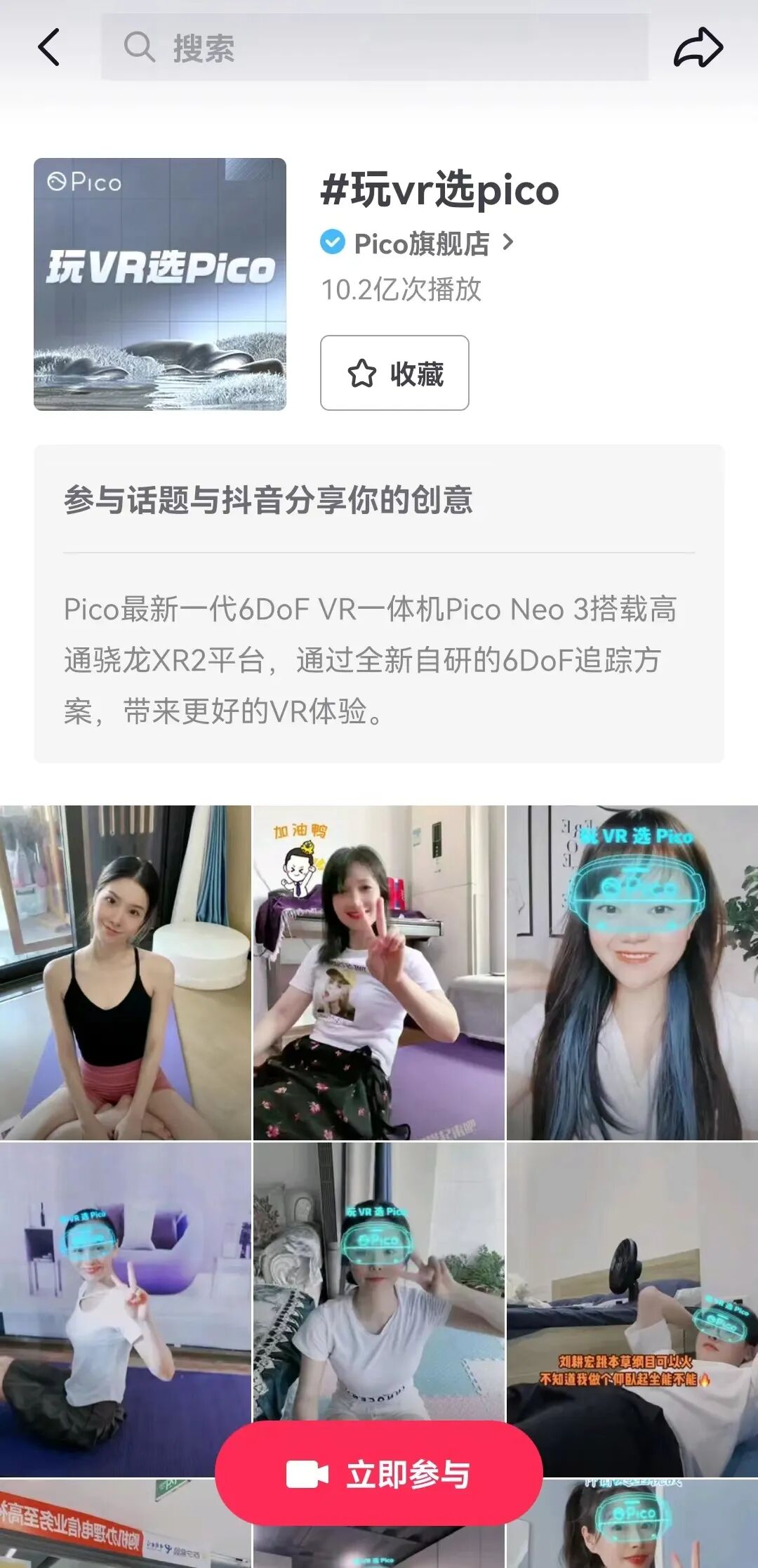 目前,抖音#玩VR选Pico话题已经达到了10.2亿的播放量。