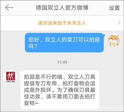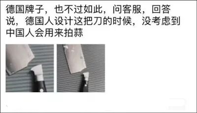 有的人现在做饭很讲究,开始给一整套刀具分三六九等。2019年的时候,双立人也发生过拍蒜断刀闹剧,客服靠专刀专用化解危机。