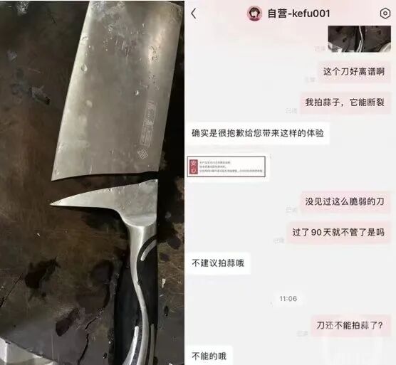 :这图片看起来有点疼,但也没消费者的心疼,自然要找客服说理去。原来现在的高级菜刀,是不支持拍蒜功能的?你要是说用菜刀,不能使內力我还服气点。尽管说得不错,后续张小泉做了善后,但菜刀不能拍蒜真是离了大谱了,这公关话术是认真的吗?相当于皮鞋不能在水里淌水,凉鞋不要冬天穿一样,蒜都不服,在大润发杀鱼十年的师傅也不买单。更尴尬的是,客服前一秒说不能拍蒜,主播后一秒又实操能拍。网上流出张小泉直播截图,有主播当场使用菜刀拍蒜,刀子活得好好的。张小泉为了公关,通宵加班,做了一把厚钢菜刀。