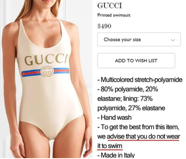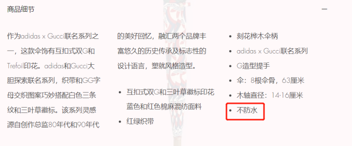 GUCCI和阿迪达斯,之前推出的联名雨伞,11100元一把。特点是:不防水(哦加3000元,防水版还是可以有!)价格伤害性很大,侮辱性也极强,这合着是把我们的智商按在地上摩擦。别问,问就是奢侈品牌的雨伞,不是普通人用来遮风挡雨,而是有钱人拿来遮月光走红地毯的。几年前GUCC出过一款泳衣,价格不贵也就4000元的。是的我没说错你也没看错,因为碰游泳馆的氯是会变形褪色,只能外穿躺沙发椅摆摆pose。总结一下,GUCCI周边作用不复杂,就一个字:装。所以GUCCI走的是奢侈的路子,尽整些虚有其名的联名,不过就是博出位,博君一笑罢了。但张小泉这么整就走偏了。这可是菜刀啊,是我们每天跟柴米油盐打交道,都要用到的菜刀,不是艺术品。说到底张小泉这波操作,就有点类似没有茅台的命,却得了茅台的额病。04