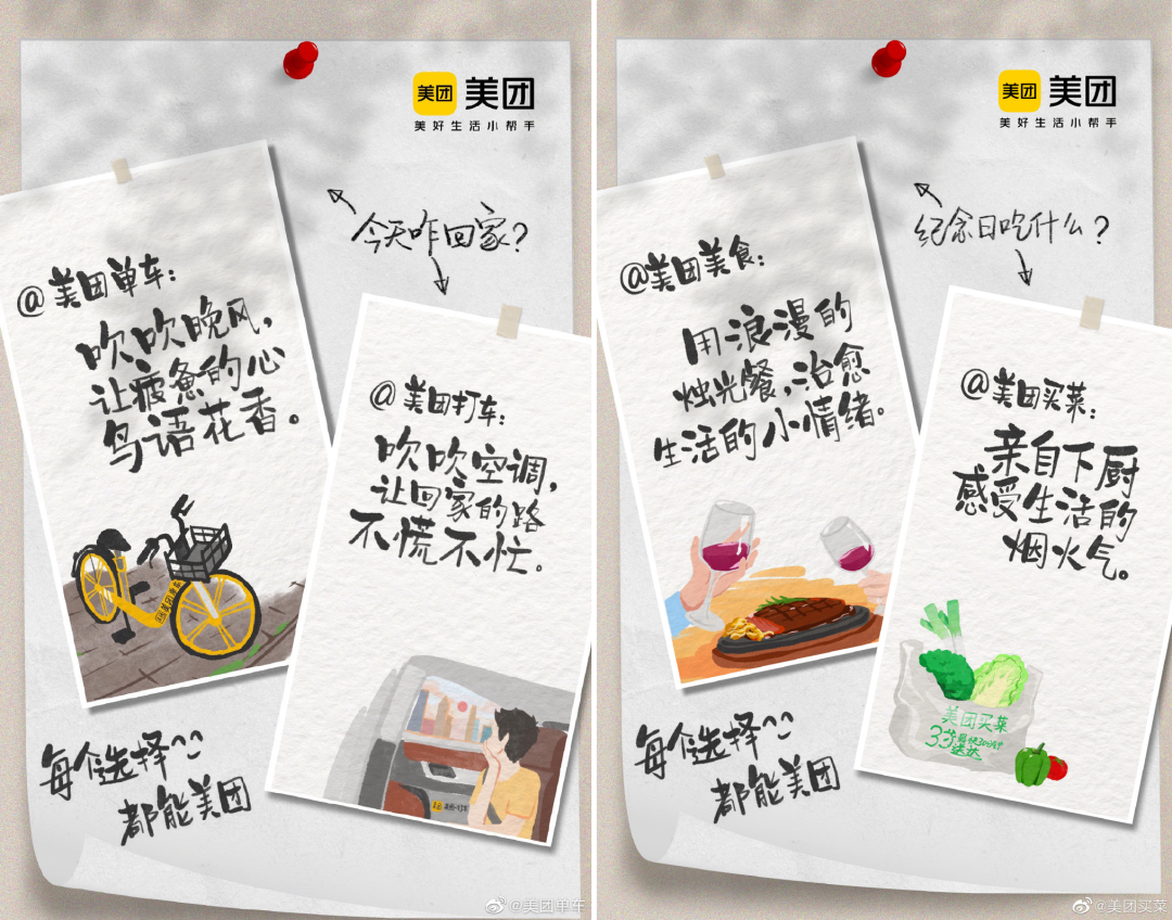 值得注意的是,不同于常见的单一场景的沟通,美团在每个小而美的故事里,都提供了两种解决方案的选择,把每个人美好生活的A面B面,展现得淋漓尽致。