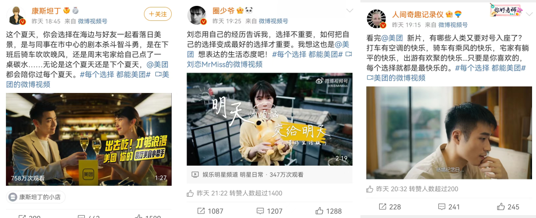 理解了这个,我们就会明白为什么在视频之外,美团邀请刘恋和更多kol发声,用意就是丰富美团更多的选择,让每个人都能从中找到“美团”,找到更多一份代入感。