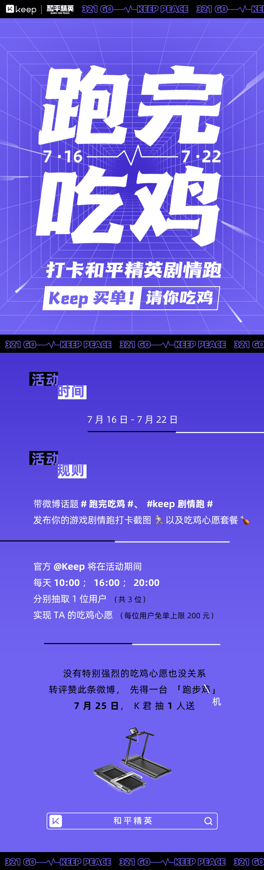 该剧情跑课程总共分为四个部分,已上线的为《闪电突进》和《暗夜逃生》。用户将以第一人称的视角空降到海盗、雨林等地图,并与队友k进行合作战斗,探索解决循环空间的方式,并且还能身临其境的体验游戏中的各种环节。此外,在 Keep 购买超级暑期卡的同时,还可以通过运动消耗的卡路里进行抽奖。同时,Keep还在微博上发起了#跑完吃鸡##keep剧情跑#话题活动,邀请用户分享和平精英剧情跑的跟跑体验,官方还将在活动期间的每天 10:00、16:00、20:00 分别抽取 话题内的1 位用户免单吃鸡。