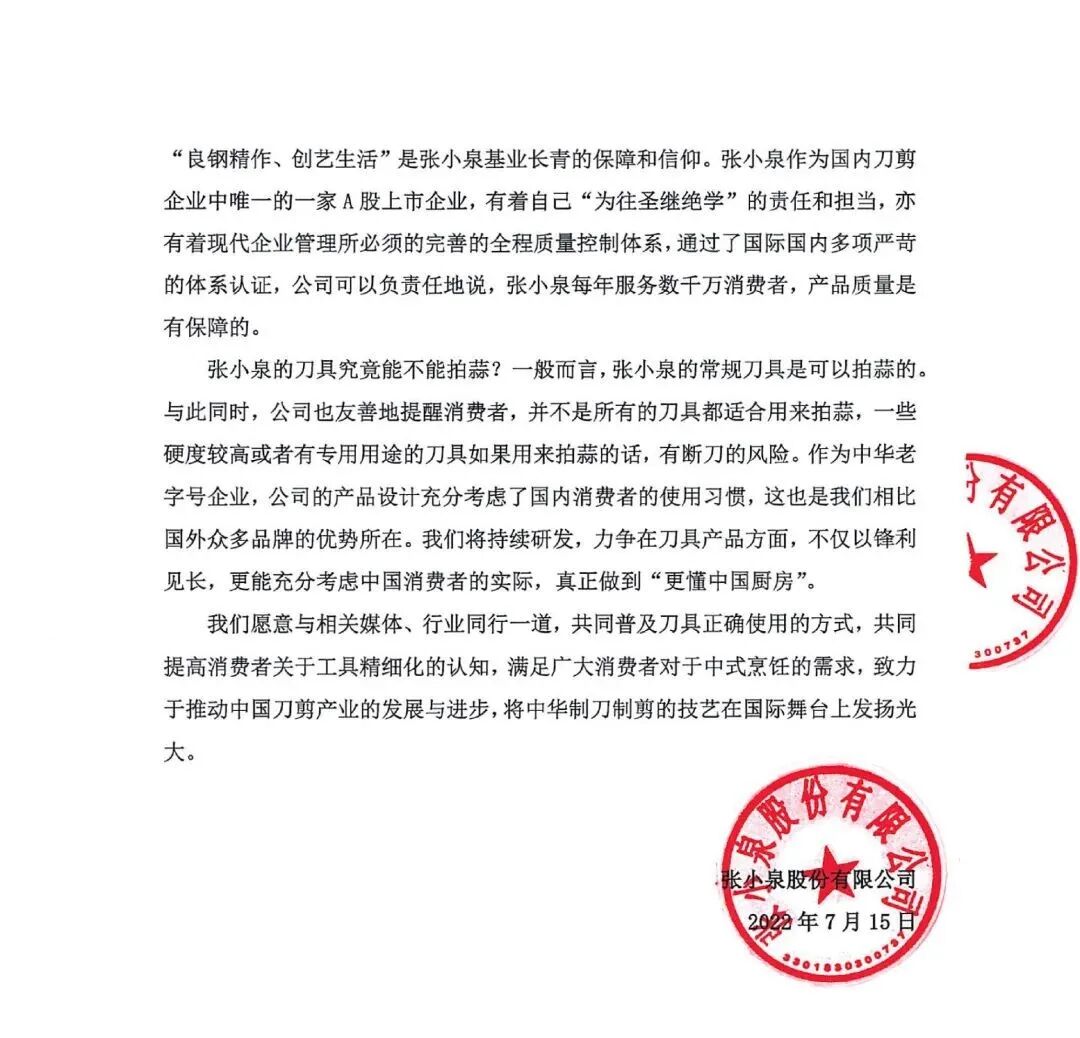 自菜刀拍蒜翻车后,张小泉也没闲着,来看第一份声明: