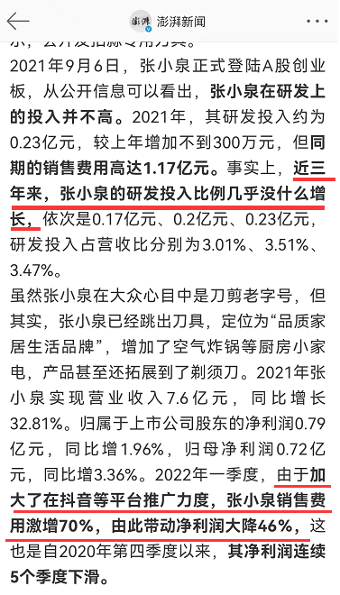 这不是没有依据的,这几年的张小泉,压根儿没把钱投入到产品研发上,而是拿来做营销。财报显示,仅仅是2021年,张小泉的销售费用达1.17亿,是研发投入的5倍。