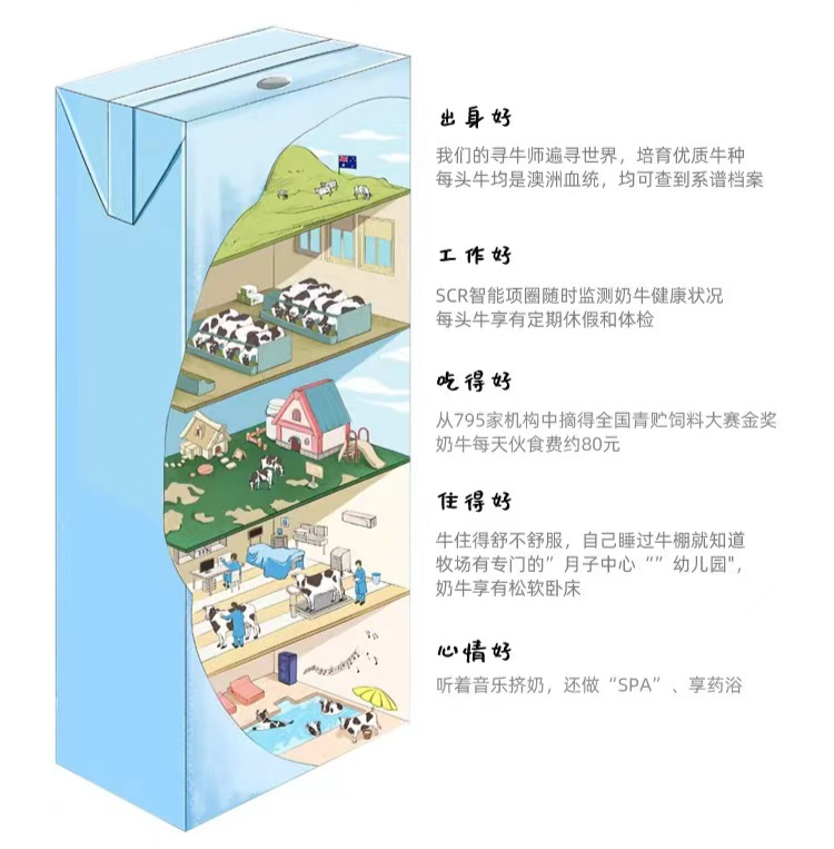 毫无疑问,让认养一头牛快速出圈的概念就是“认养”。它告诉消费者,他们喝的奶甚至能追溯到特定一头奶牛。