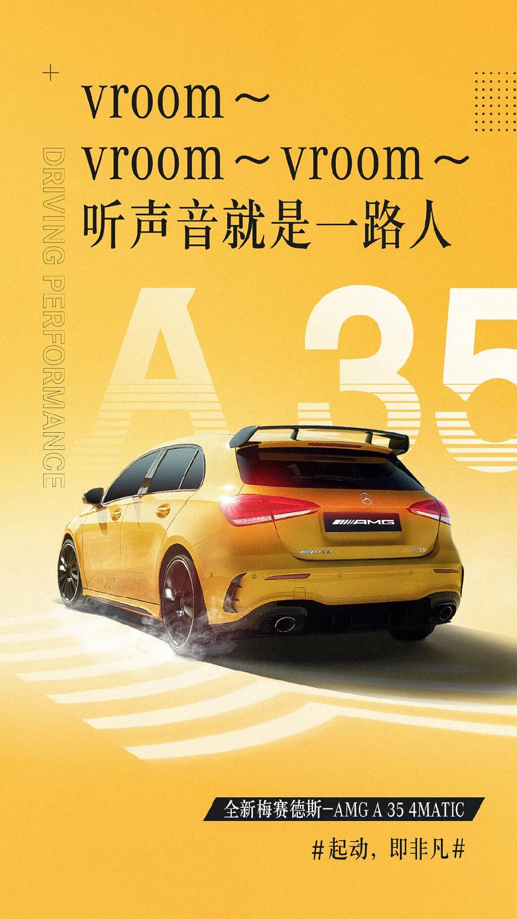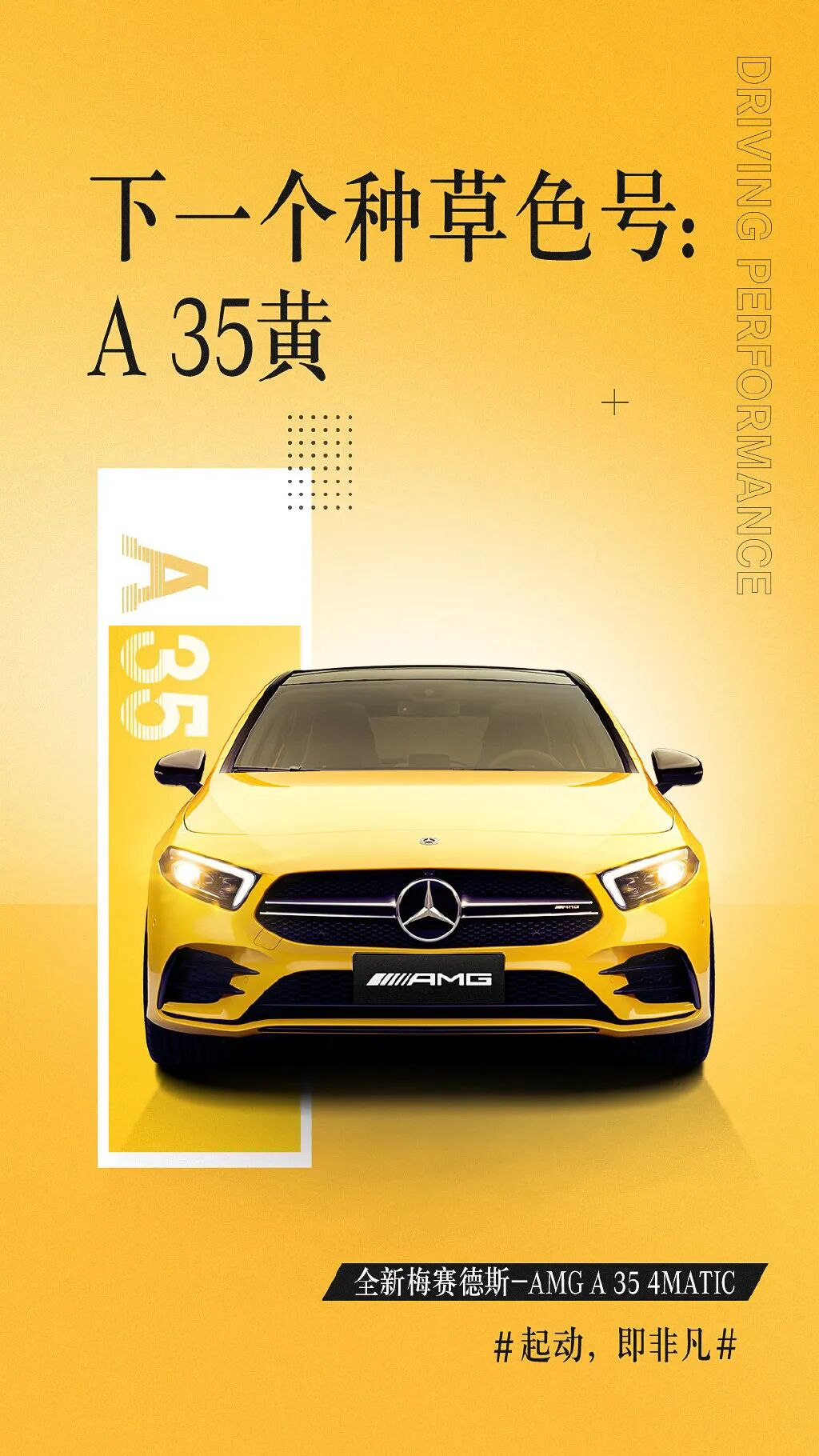 35张海报,35家品牌,35个彩蛋。A 35明明只是一个车型名字,但梅赛德斯-AMG却巧妙将车名玩梗玩出精。要知道这款车主打的概念就是“非凡驾驭”,纵观这35张海报,每一张海报品牌主都cue上不同兴趣喜好的年轻人。可见这波联合并不是毫无目的性,梅赛德斯-AMG是用心寻找与自身品牌调性契合、目标年轻粉丝重叠的品牌挚友发声:统一以欢迎成为车主的口吻,营造出契合度满满的cp感。在联合品牌发声的同时,梅赛德斯-AMG从头到尾都站在年轻人的视角出发,潜移默化向年轻人传递了一个核心信息——你们喜欢的快乐样子我都有:好听、好玩、好开、好潮、好色.......进而把游戏、运动、科技等不同圈层粉丝圈足。这样连续输出梅赛德斯-AMG A 35 4MATIC的产品卖点,将外在颜值到内在功能呈现得淋漓尽致,生动有趣,也加深了年轻人对于#起动,即非凡#slogan的认知,自然吸引潜在A 35车主对号入座。
