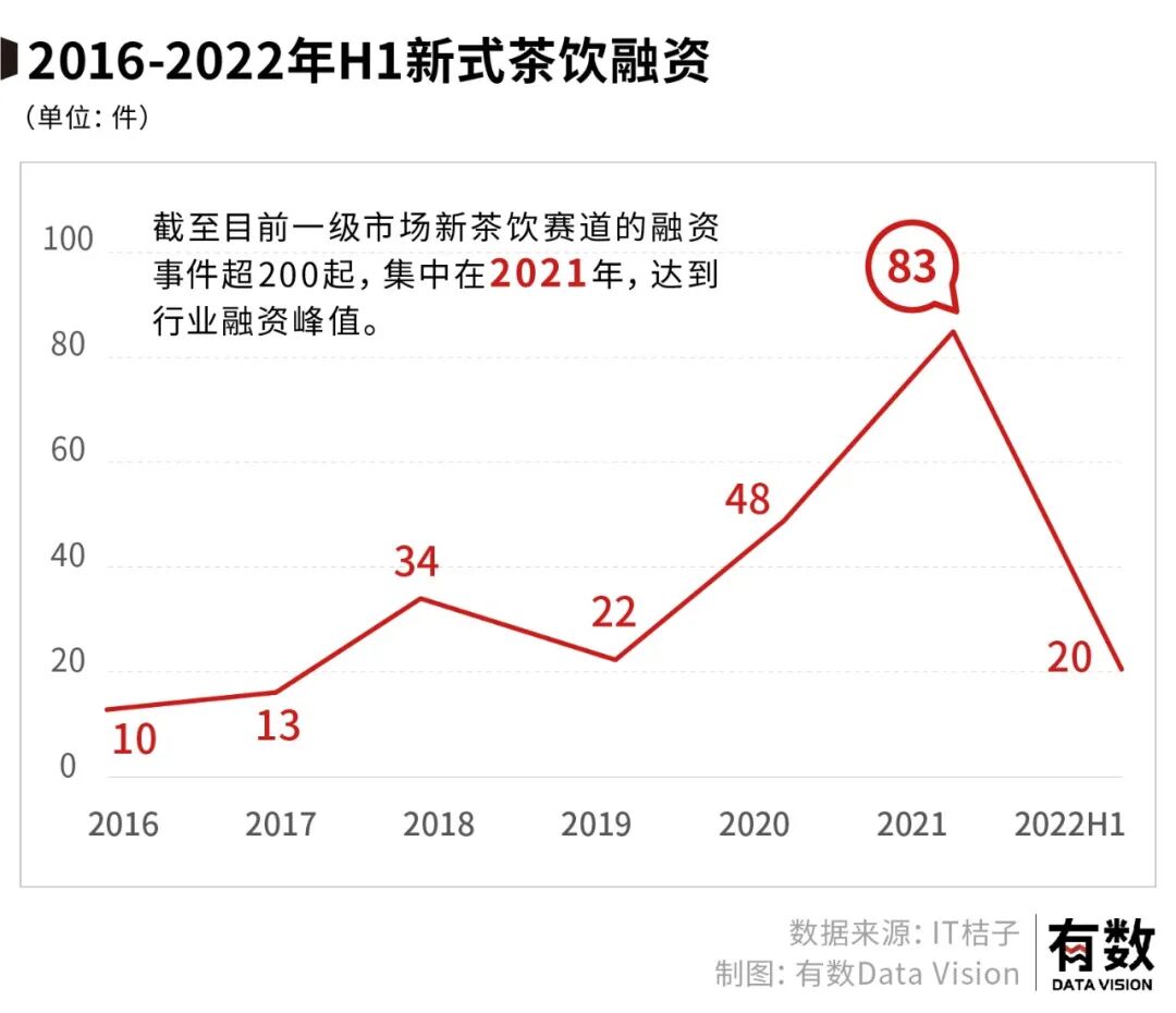 下游新茶饮行业进入门槛较低,且受资本青睐,新进入玩家数量众多。根据IT桔子数据,截至目前一级市场新茶饮赛道的融资事件超200起,集中在2021年,达到行业融资峰值。