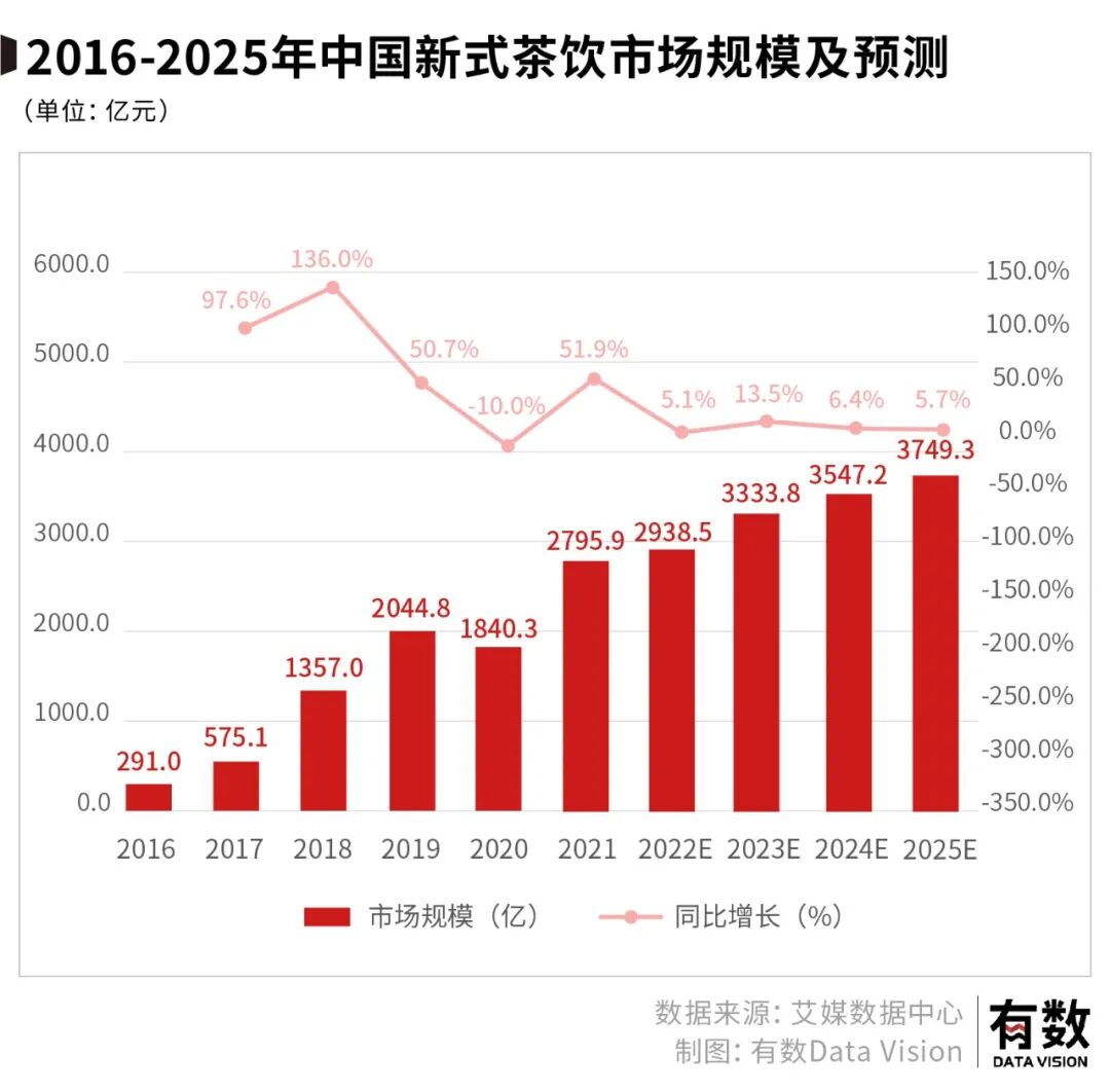 回看新茶饮的发展历程,近五年为新式茶饮发展的黄金5年,行业市场规模翻了近10倍,目前市场规模增速已开始放缓,未来五年的增速均值仅为6%。