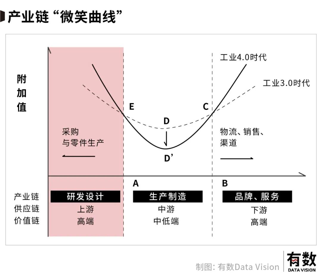 我们一般看产业链价值分布,是呈 “微笑”曲线,前后两端朝上,而产业链的中间部分较低。因附加值更多体现在上下游,一般属于产业链的研发和销售端,而处于中间环节的制造,附加值最低。