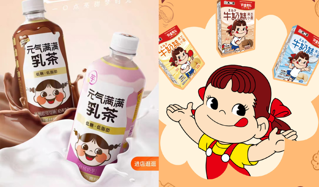 如果说像钟薛高只是个误会,那伪日系营销真的说不清了。气泡水包装多用白、绿、蓝的清新色系,好好的“气”字放着不用,偏要用日文“気”,瓶身背后还印着“日本国 株式会社”的字眼。 元气森林乳茶包装的妹妹头像,也被评价像极了日本不二家棒棒糖logo。