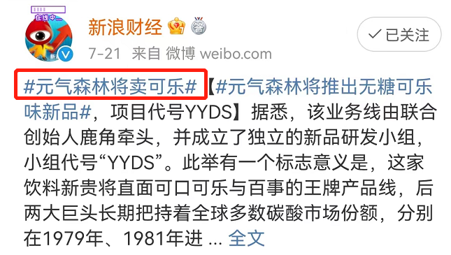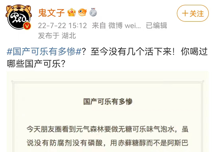 只不过热搜跟0糖和气泡水无关,而是关乎元气森林做国产可乐。