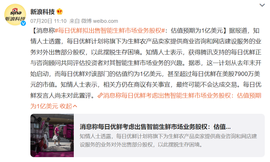 近日,有消息称每日优鲜正考虑出售其智能生鲜市场业务的部分股权,其对该业务部分的估值约为1亿美元。