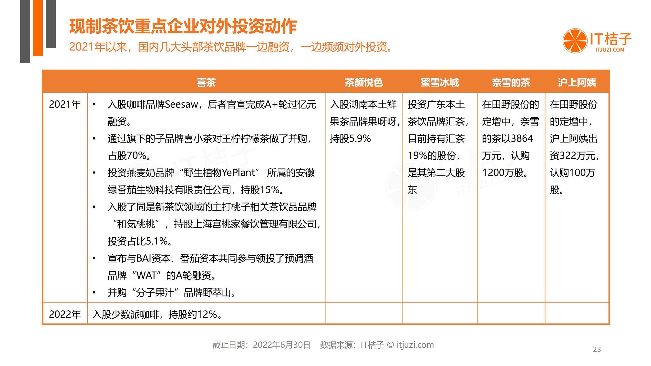 与此同时,现制茶饮品牌也在不断的对外投资并购扩张品类。