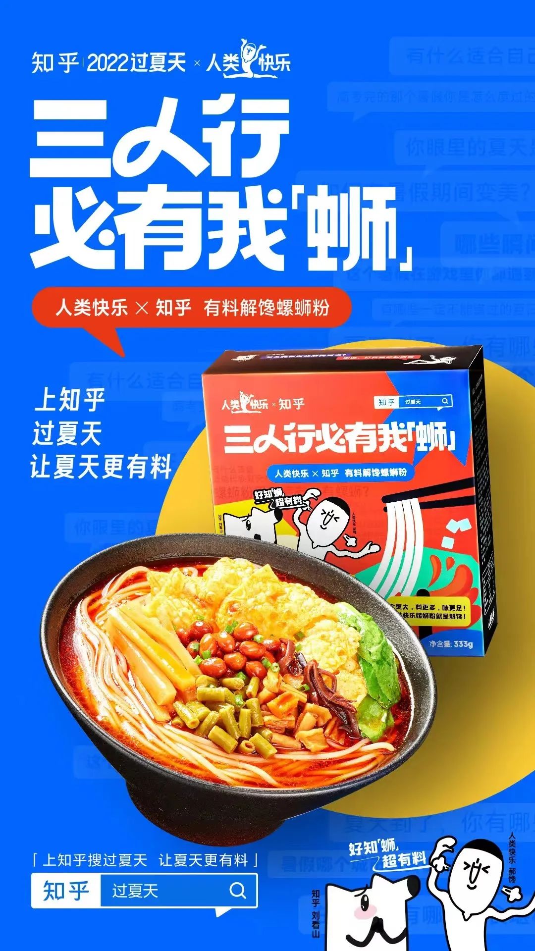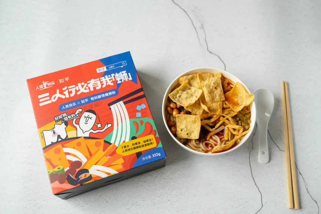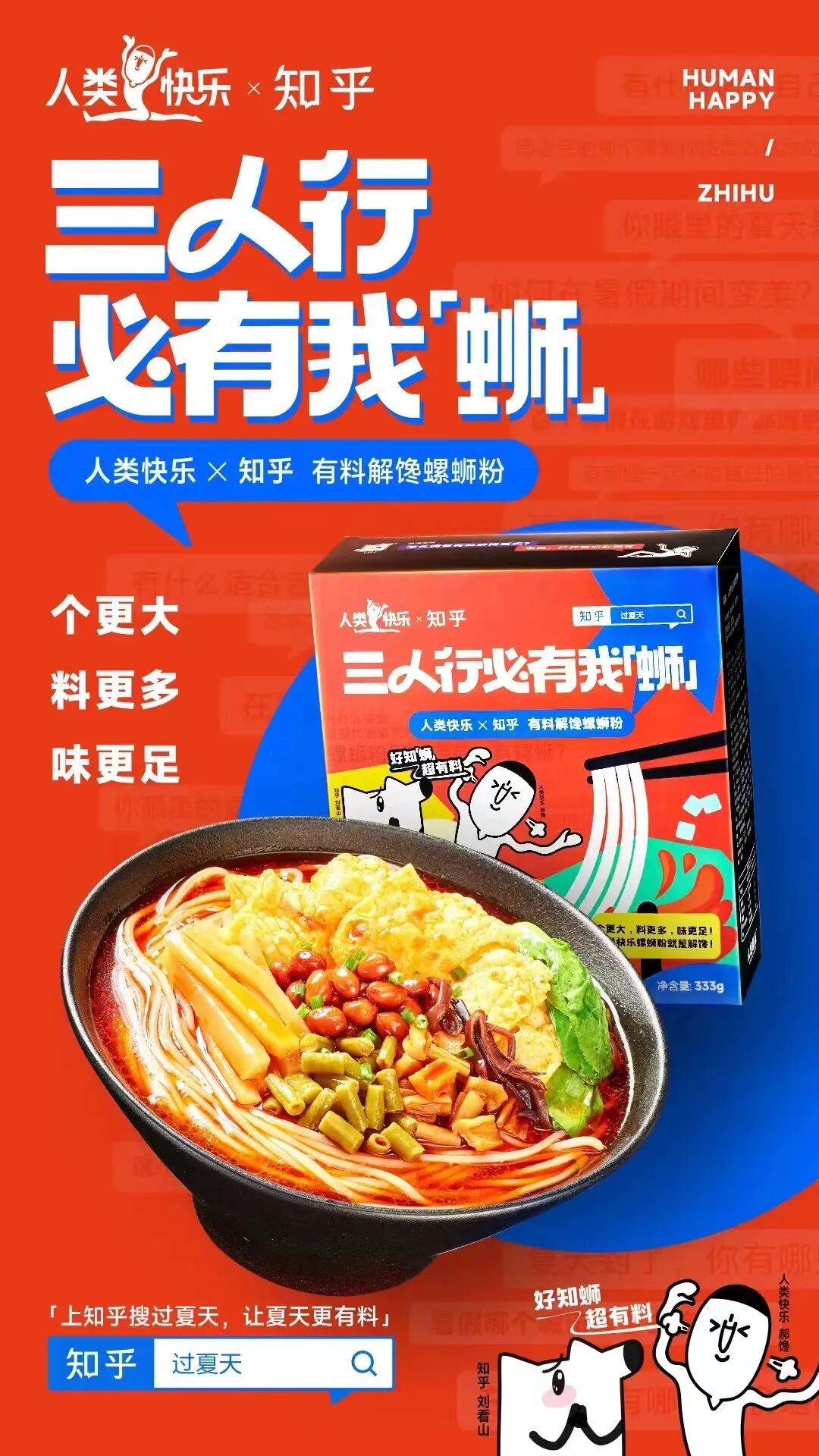 知乎和人类快乐螺蛳粉,这两个看似风马牛不相及的品牌合作出新品,本身就反差感十足,关键连新品的名字——「三人行必有我蛳」,都起得自带CP感。