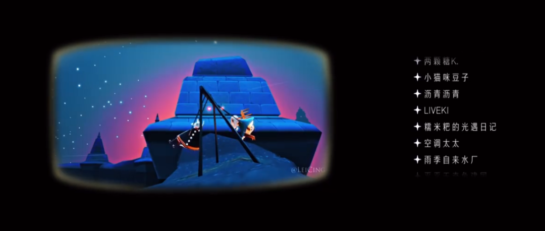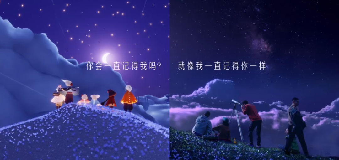 光遇虽然被归为冒险类游戏,但游戏的治愈属性却来源于玩家共同创造的情感故事。用精美文案表达的品牌故事更能让用户获得治愈感。“你会一直记得我吗?就像我会一直记得你一样”。前半句是小心翼翼的询问,害怕因为游戏相遇的缘分最终也会随着虚拟世界的一切随之被遗忘,后半句的真诚坚定的肯定玩家之间永远存在的情感。写到心间上的文案,配合虚实交换的场景,更能让玩家触发对于游戏的感情,从而被治愈。TVC作为消费者了解品牌形象和理念的重要窗口,有着不可替代的作用。TVC的本质是内容,设置一个能引起共鸣的观点是最能圈粉用户的方法。光遇的品牌短片就提出“光是遇见就很美好”的核心理念。向玩家展示一种坦诚的心境:在虚拟世界已经历的点点滴滴,都是值得被纪念和永久珍藏的美好记忆。短片彩蛋更是将玩家的游戏录屏剪成花絮,附上一连串的ID致谢,如此治愈走心的策划正是印证品牌的精神内核。