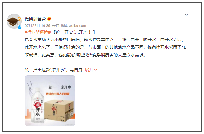 农夫山泉等品牌看到了熟水市场的红利,随后加入了这一市场,推出大单品“白开水”;旺旺也推出过“旺旺凉白开”,但只是在自己的售货机中销售。