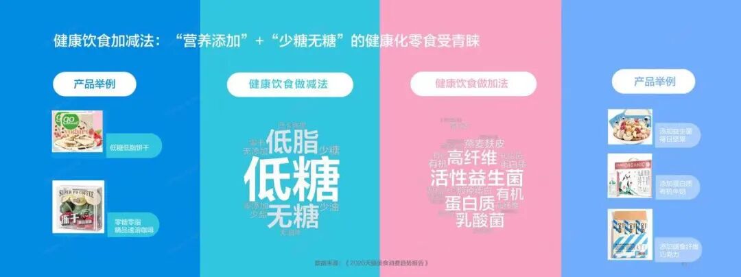 据CBNData《2020新健康消费趋势报告》显示,人们在饮食上的健康化转变,一方面是做减法,如追求“低糖低脂无添加”,另一方面则是蛋白质、活性益生菌等营养上做加法。
