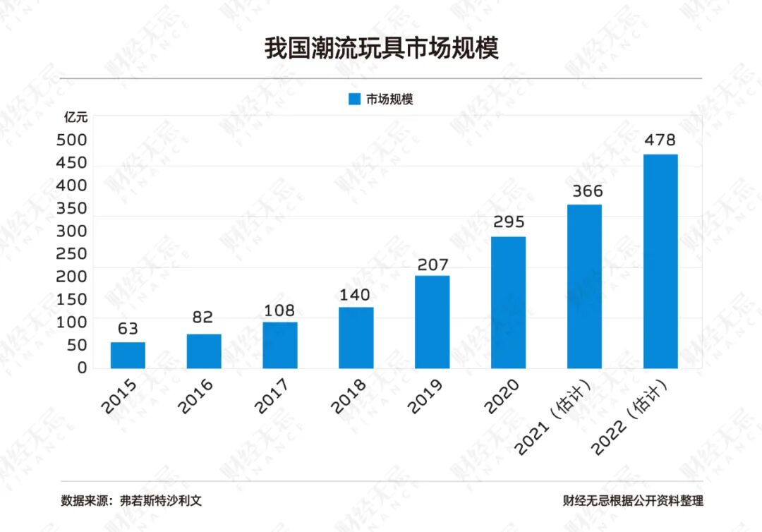 根据中国社会科学院国情调查与大数据研究中心发布的《2021中国潮流玩具市场发展报告》,中国潮流玩具行业发展势头迅猛,市场潜力很大。数据显示,2015年我国潮玩产业规模已经达到63亿元,2015-2020年复合年增长率高达36%。预计2022年中国整个潮流玩具零售市场规模将达到478亿元。