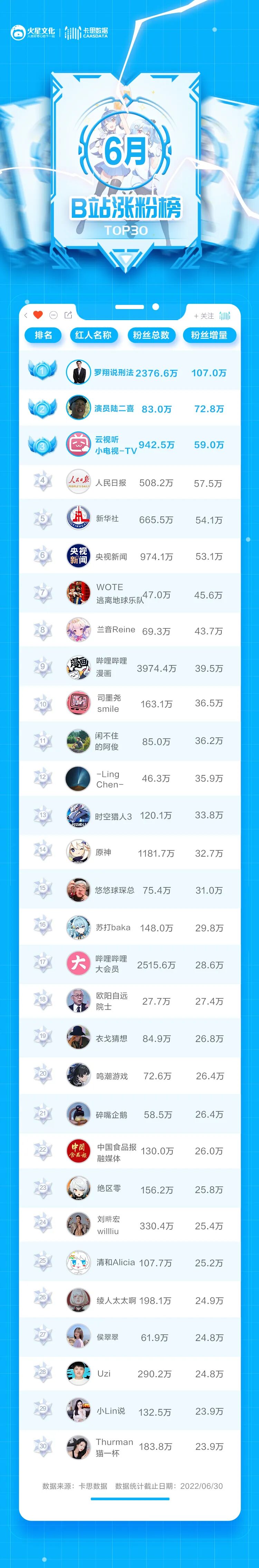 从涨粉区间来看,6月的B站进入了“温水区”。粉丝增量在50W以上的个人UP主仅有两位,其一是长期霸榜的@罗翔说刑法,在6月又获得超100万的涨粉量;其次是因《激战江南》中的一段表演成为鬼畜区常客的@演员陆二喜,与谭乔联动的恰饭视频《梗王王中王》截至目前获得892万次播放。