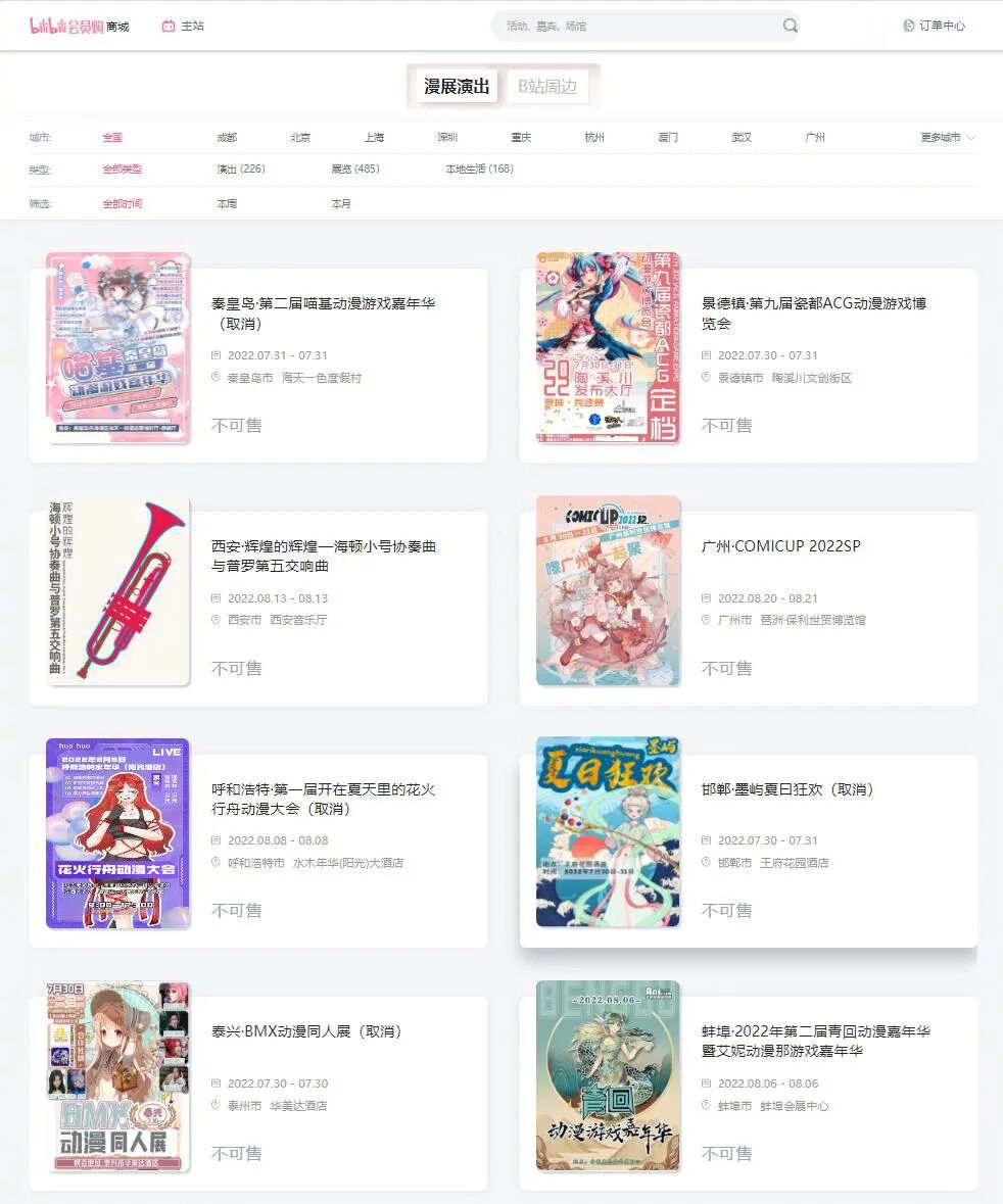 随后,据bilibili会员购显示,全国各地超过60个漫展相继宣布延期或取消。这些漫展中,大多数并没有用“夏日祭”的名号,甚至一些本土动漫展、国风展也在其中。▲ 图源:bilibili会员购