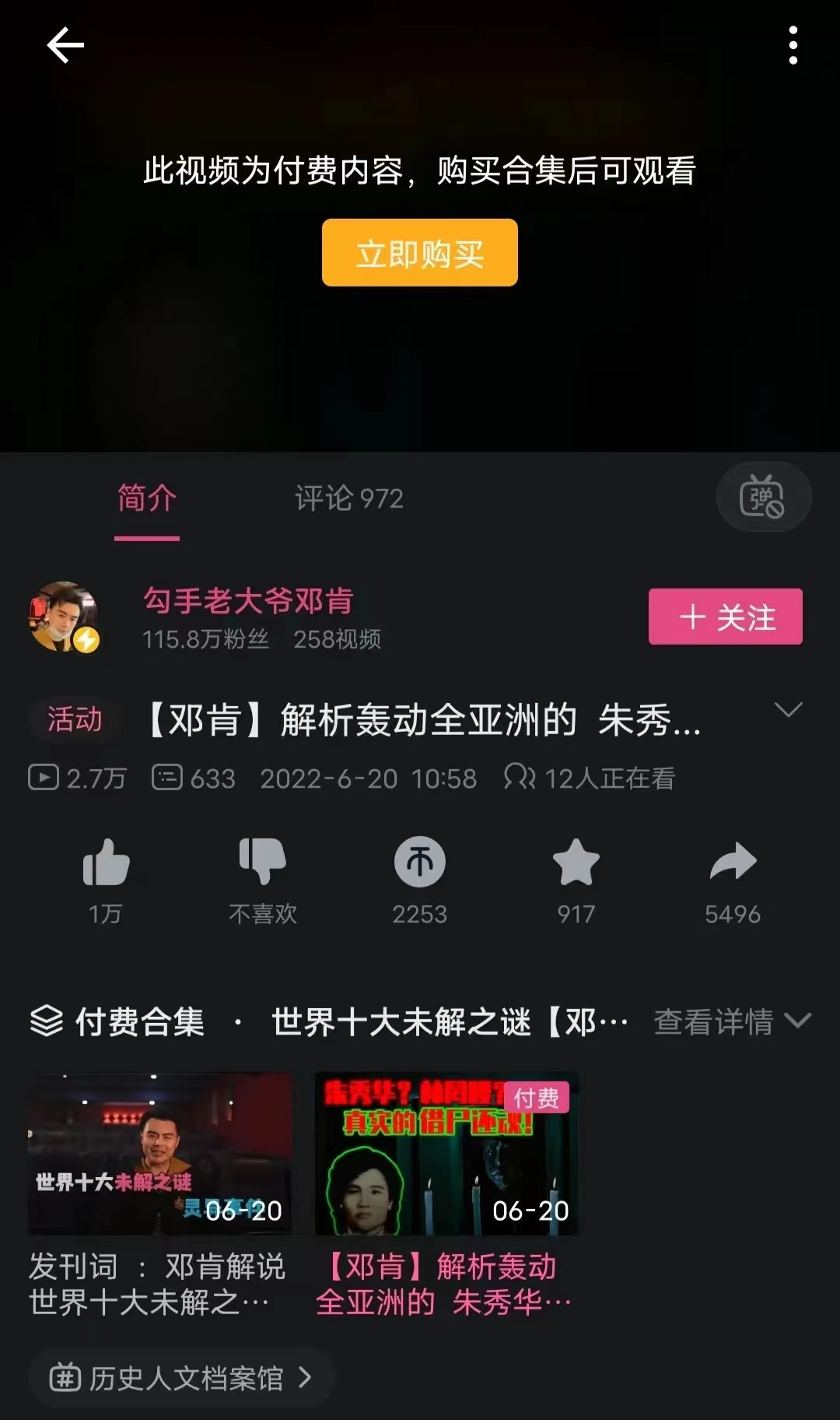 此前,B站尝试上线付费视频功能,UP主“勾手老大爷邓肯”上传的10部“世界十大未解之谜”系列视频,需要30元购买。消费一出,引发了争议。花钱买了会员就不能再付费观看、视频质量不值30元等,是网友对这次事件的议论焦点。