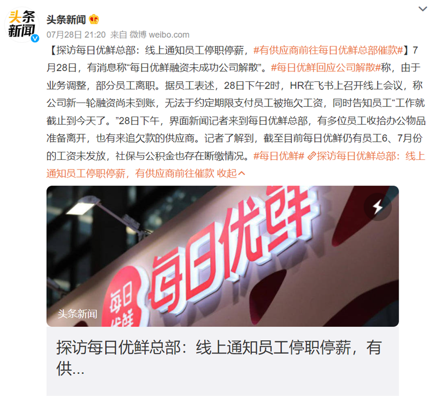 网传信息显示,就在昨日下午2时,每日优鲜召开线上会议,称公司新一轮融资尚未到账,无法于约定期限支付员工被拖欠工资,同时告知员工“工作就截止到今天了。”