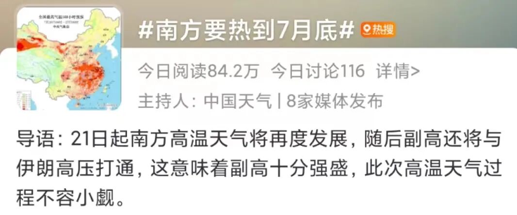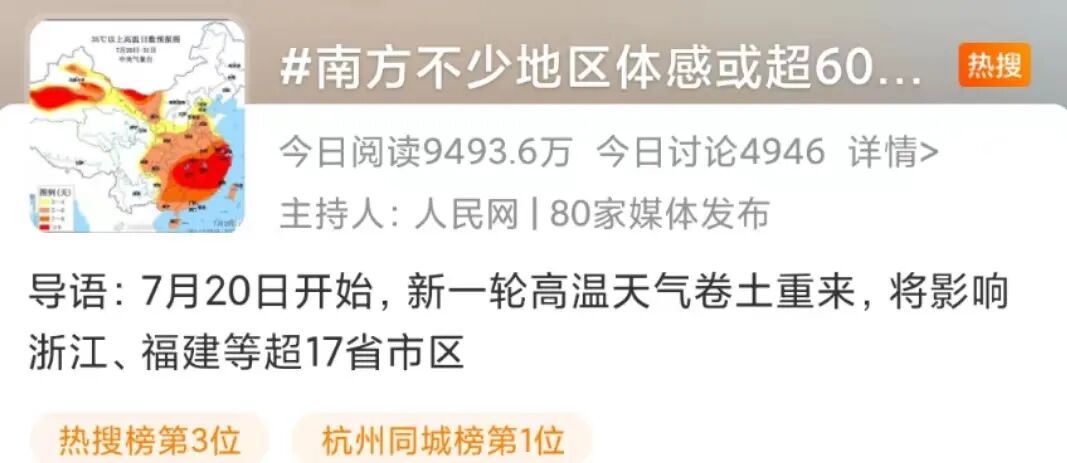 对于纬度更低的南方而言,这天气简直是酷刑。用网友调侃的话来表示:“江浙沪”变成了“工折户”,“包邮区”热成了“保熟区”。