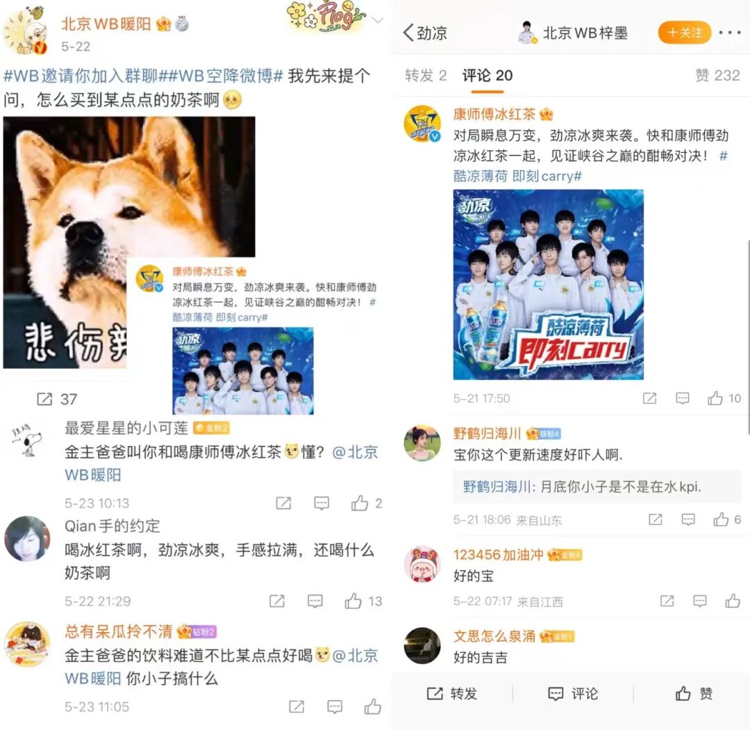 在明星选手的微博评论区,@康师傅冰红茶 官微亲自为选手助力,并植入品牌信息,在提升品牌好感度的同时,加强了一波品牌和电竞属性的关联度。