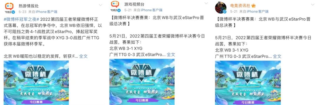 5月22日,微博杯王者荣耀职业比赛落下帷幕,@北京WB王者荣耀分部 强势问鼎冠军。此次微博杯在斗鱼与快手双平台直播,全网观看人次超过3200万,微博相关话题阅读量超4亿,点燃了战队粉丝及电竞用户的讨论热情。
