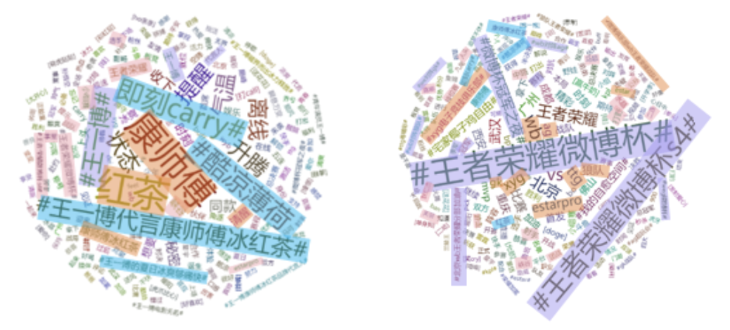 通过词云可以看到,康师傅劲凉与微博杯的关键词实现深度绑定,87%热度提及来自普通用户,在玩电竞、看电竞的场景下,康师傅劲凉成为了优先选择。