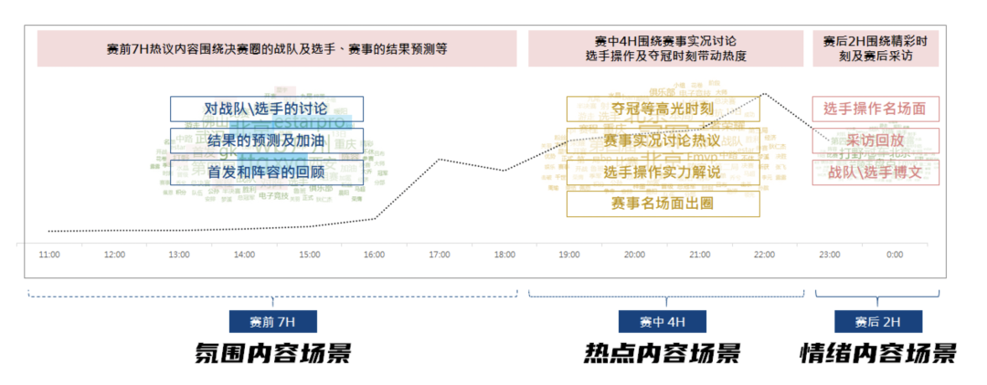 在通过对过往赛事期间用户热议内容的洞察,不难发现用户各个阶段的关注点及内容生产者之间是存在差异的。赛前,用户更多的是为战队加油助力,或是预测最终的比赛结果,而决赛直播期间,用户的关注点更多是围绕高光操作与选手发挥。