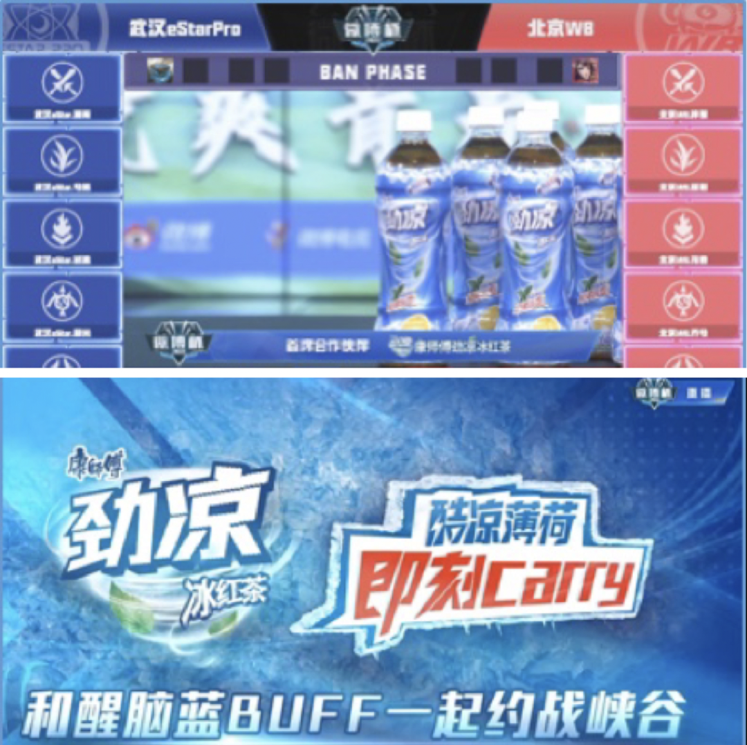 通过战队选手首发界面的展示、BP环节的产品特写等方式,康师傅劲凉冰红茶进行了电竞场景的深度开发,向用户直观地传达了品牌年轻化的态度。