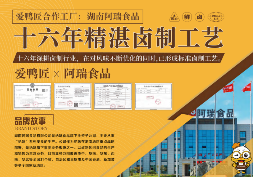绝味食品招商负责人属于湖南阿瑞食品有限公司。天眼查显示,这家公司由由绝味全资控股。该负责人表示,今年在力推爱鸭匠新品牌,早在2018年就在内部开始研发,目标受众群体是年轻一代消费群体,在保留绝味经典口味上进行了一些创新。在今年7月爱鸭匠也开始在全国开放加盟,整个加盟政策与绝味初期一致,下放区域代理商权限。