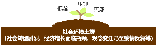 再加之最近半年国内经济的周期性波动,疫情反复、疫情管控对生活造成一定程度的不便等短期显性因素导致这一年龄层的社会心态变得更矛盾、更压抑、更焦虑。