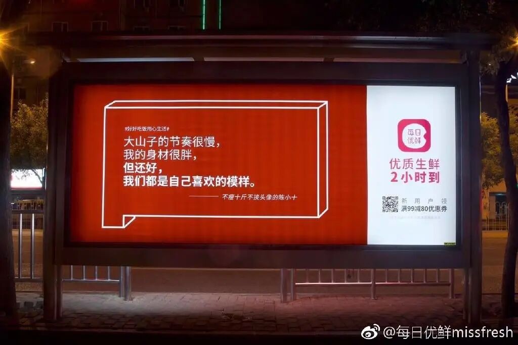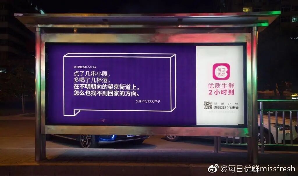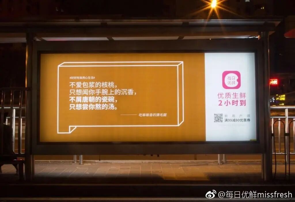 除了看得见摸不着的平面,每日生鲜还曾包下了北京街头1000块广告牌,用文案里的各种滋味,真正“照亮”回家的路。