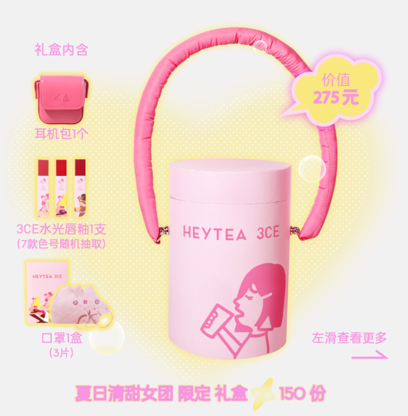 除此之外,纸袋、口罩、充气杯套、限定礼盒等惊喜周边更是一度成为社交货币,粉色的运用不仅贴合车厘子饮品的色调,还和此次「清甜女团」的主题相呼应,真真简直拿捏住了网友们的少女心,没有一件鸡肋周边。怪不得网友喊话喜茶开个周边小店,搞不好会比饮品更火?05