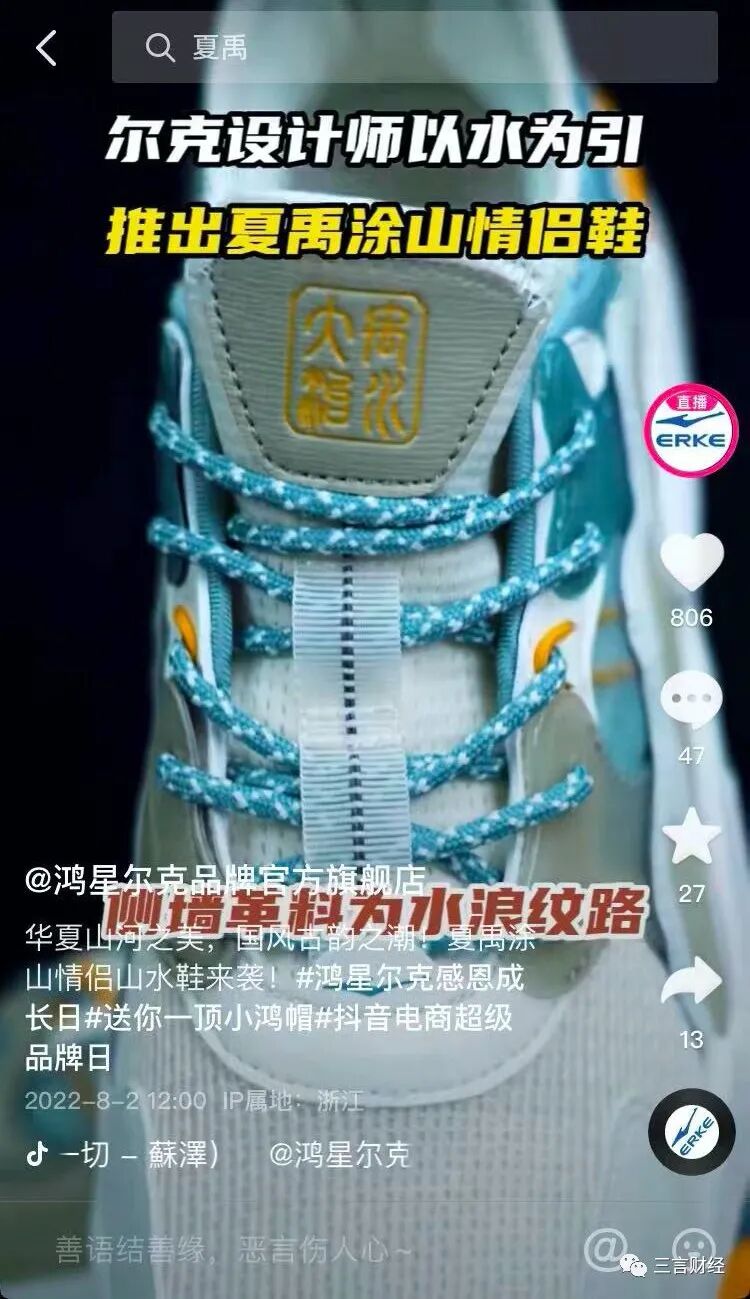 当时,在“野性消费”之余,也有网友曾给鸿星尔克提出建议,比如“要用饱和色”、“设计简约一些”、“提高图片质量”、“个性化定制”等等。后来,鸿星尔克也曾推出过一些新的设计,但结果并不理想。比如这款以水为引的夏禹涂山情侣鞋。鸿星尔克曾多次在其抖音账号发布相关视频来宣传。